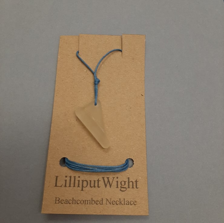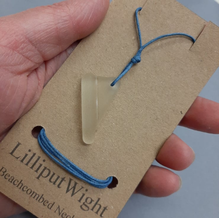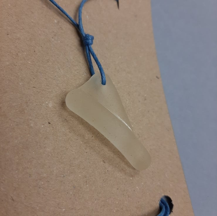 This necklace is made from a naturally shaped piece of sea glass. The sea frosted glass piece has been suspended from a cord of blue waxed cotton. A pair of sliding knots allow the length of the necklace to be adjustable and yet stay at the desired length.