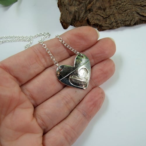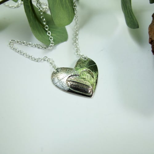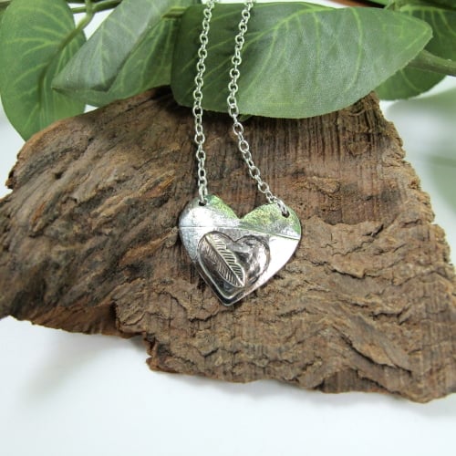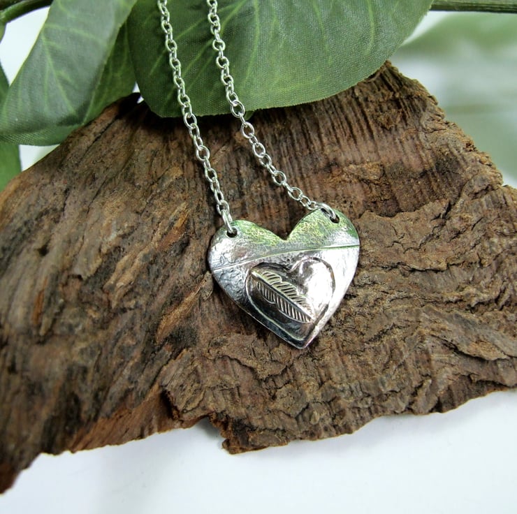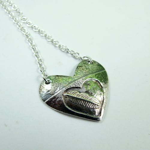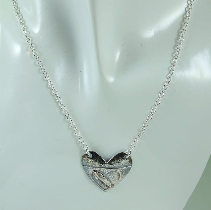 I made the heart pendant from sterling silver sheet, cut by hand then verlaid with a second layer of silver from which I cut out another heart, soldered inside the second heart is a tiny silver feather. I have textured the hearts and given an oxideised finish. Fitted to an 18 inch sterling silver chain.