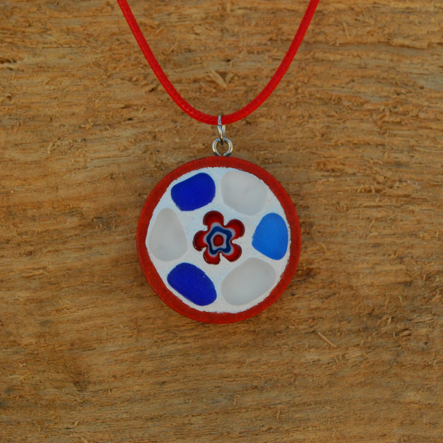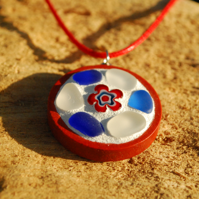 Six little pieces of tumbled beach glass make up this pretty pendant. Blue beach glass is rare, so we use tiny pieces for mosaics. These pieces go well with the lovely little millefiori flower in the centre of the pendant. The back of the pendant is wood.