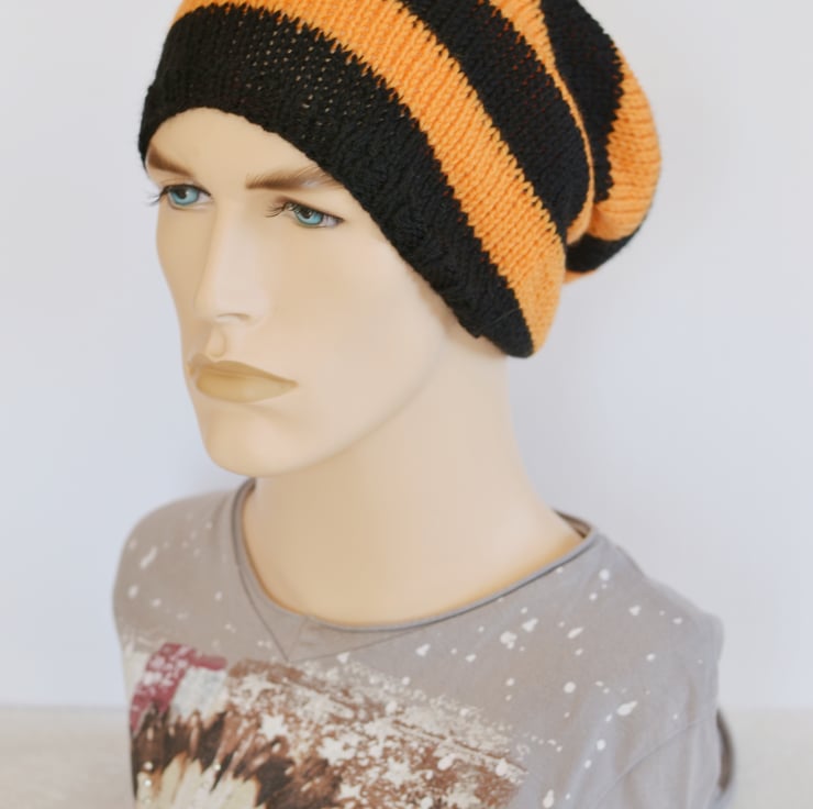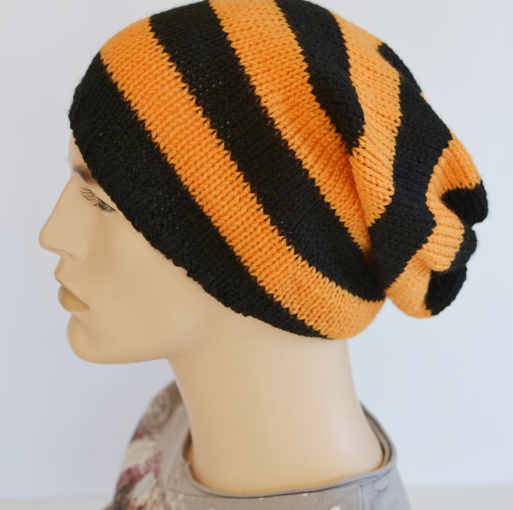 Knitted slouchy beanie hat. Knitted myself in 100% acrylic in stripey bands in black, bright yellow and white.