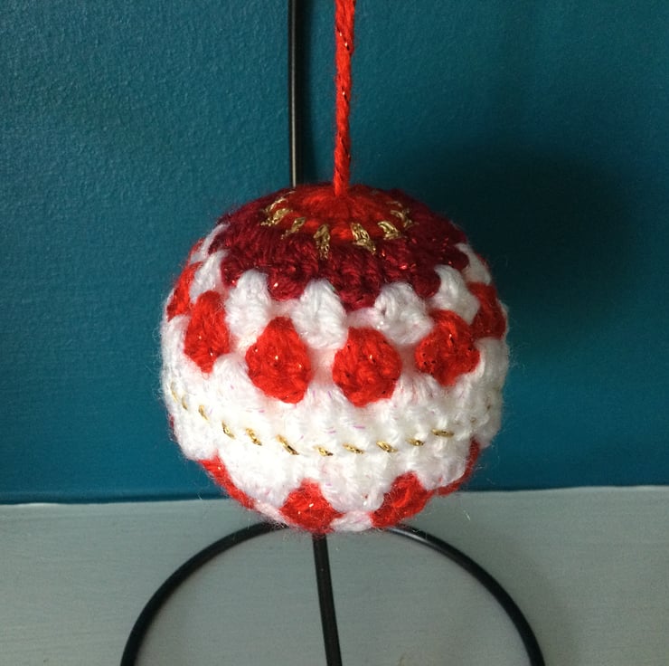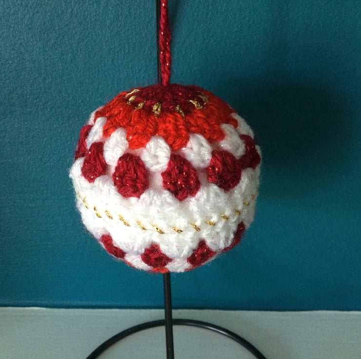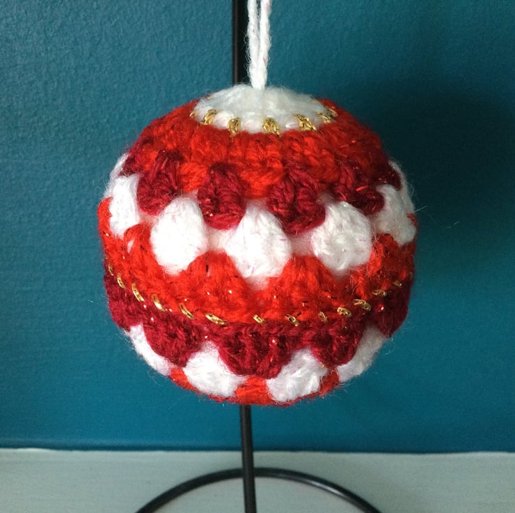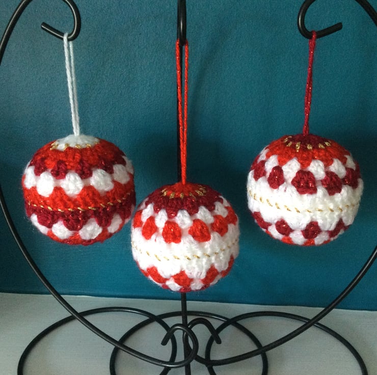 I have crocheted this set of 3 festive baubles using a gorgeous twinkle yarn in white, two shades of red and a gold lurex thread, each one is different but uses variations of the same colours.