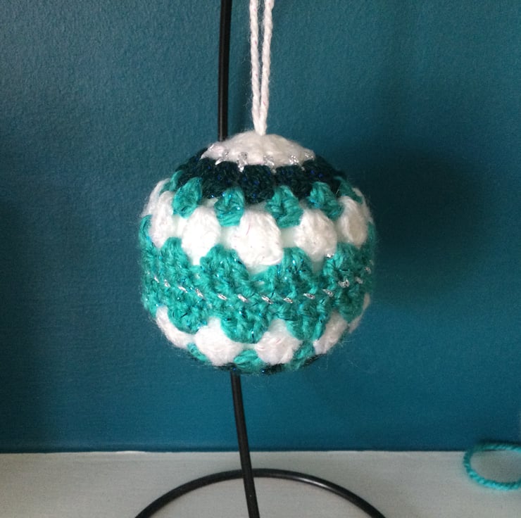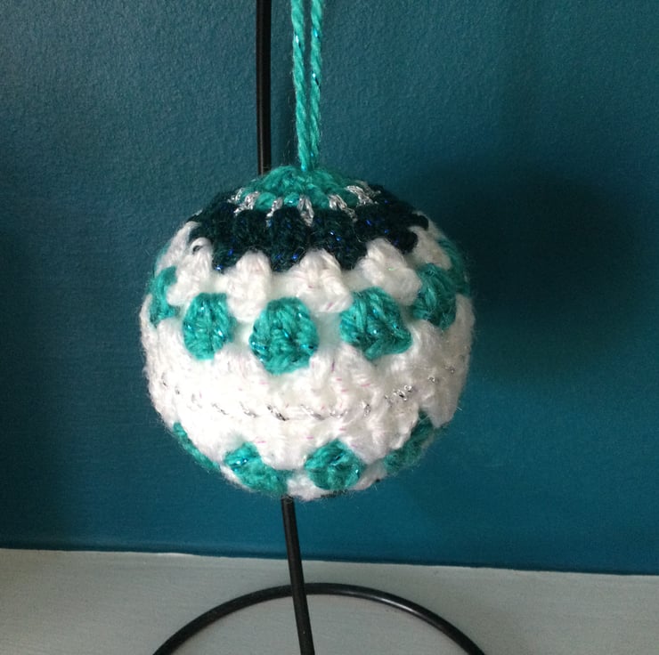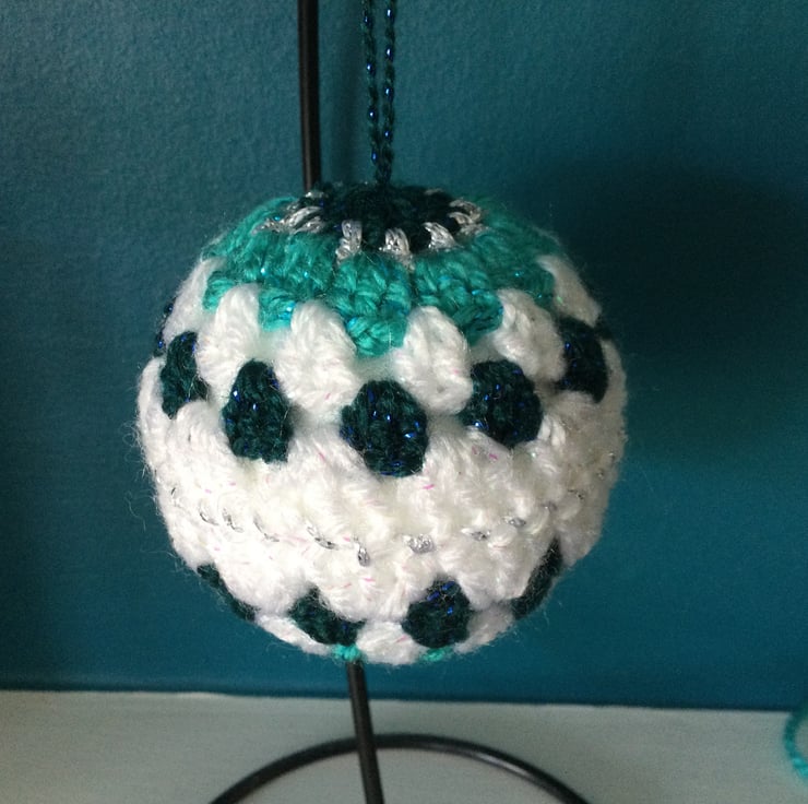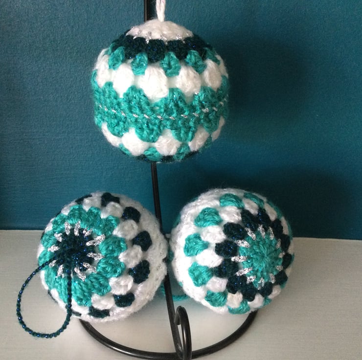 I have crocheted these 3 Christmas tree baubles using a pretty sparkly acrylic yarn in white, 2 shades of turquoise and a silver lurex thread. Each one is made in a variation of these same colours.