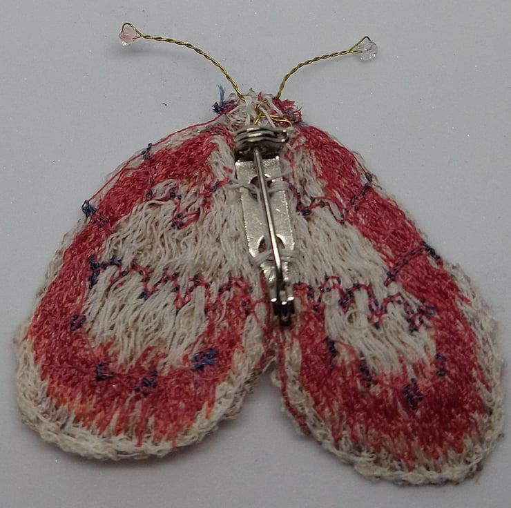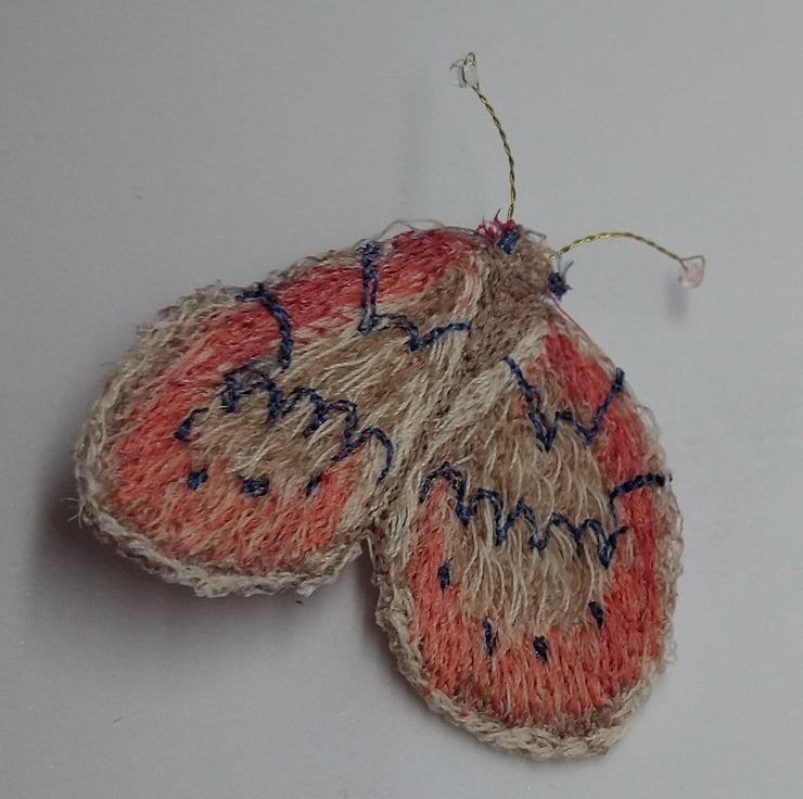 I love spotting butterflies and moths and am always drawn to the beautiful colours. This unique brooch is inspired by the beautiful and amusingly named Rosy Footman. My moth brooches are made almost completely of thread: I ‘draw’ onto water-soluble fabric with my sewing machine, creating an interlocking network of thousands of stitches, choosing my colours to best capture the spirit of the moth. The fabric is then washed away leaving a delicate looking but surprisingly tough thread moth. I add wire and bead antennae and a brooch back to complete my piece. Each piece I make is unique and created with care and love.