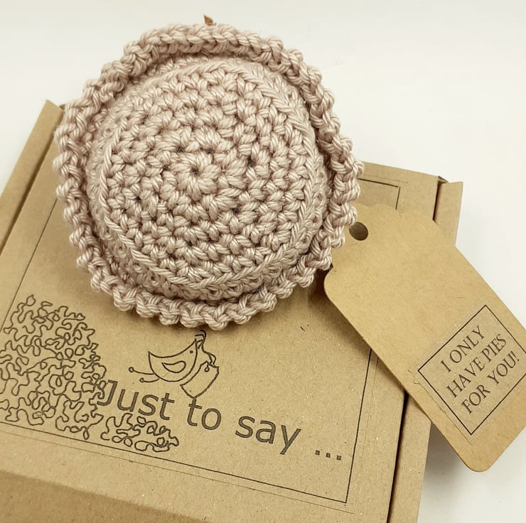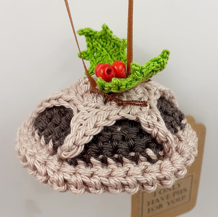 This tasty looking mince pie decoration crocheted in cotton and filled with polyester stuffing. The holly is from a pattern by Lucy at attic24 and the berries are painted wooden beads and there is a narrow ribbon hanging loop. The tag reads 'I only have pies for you! although I am very happy to exchange this tag for one with wording of your choice.