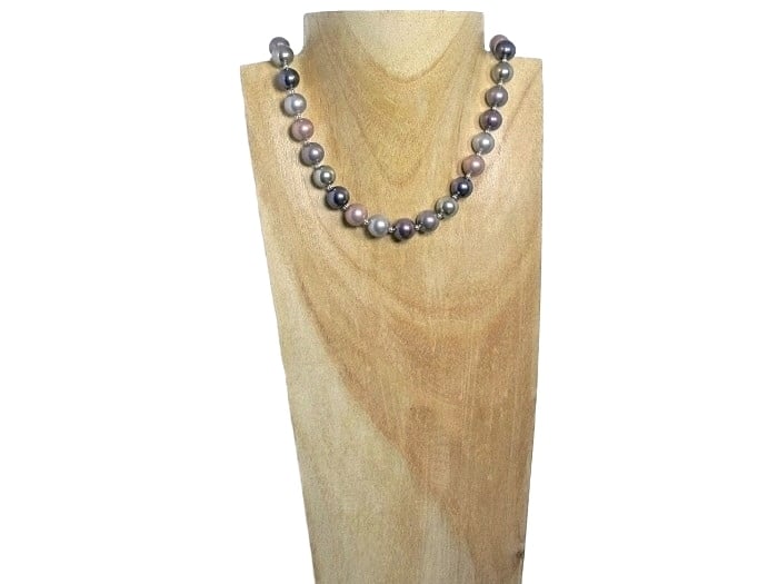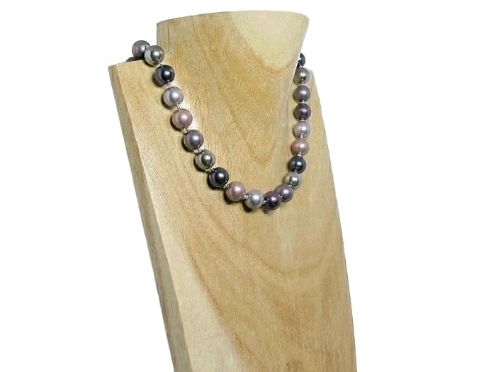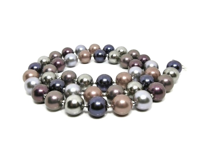 I handmade this chunky necklace with colourful 10mm shell pearls in purple, silver, burgundy & peach. A pretty combination.