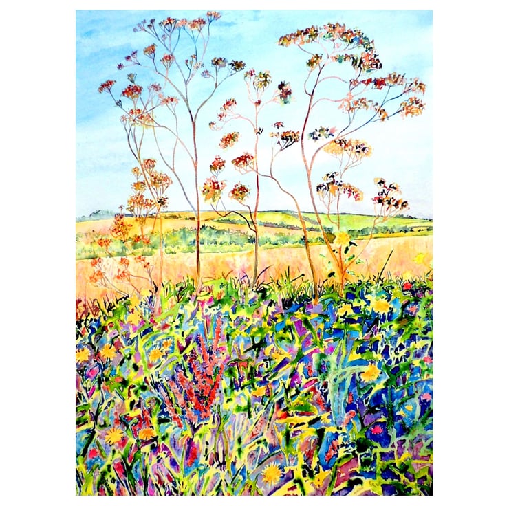 The only incline around for miles gives a backdrop of fields of corn and pasture to the gangly and expressive cow parsley rising above a riot of undergrowth. There are bronze and gold 'markings' and highlights enriching this colourful painting.