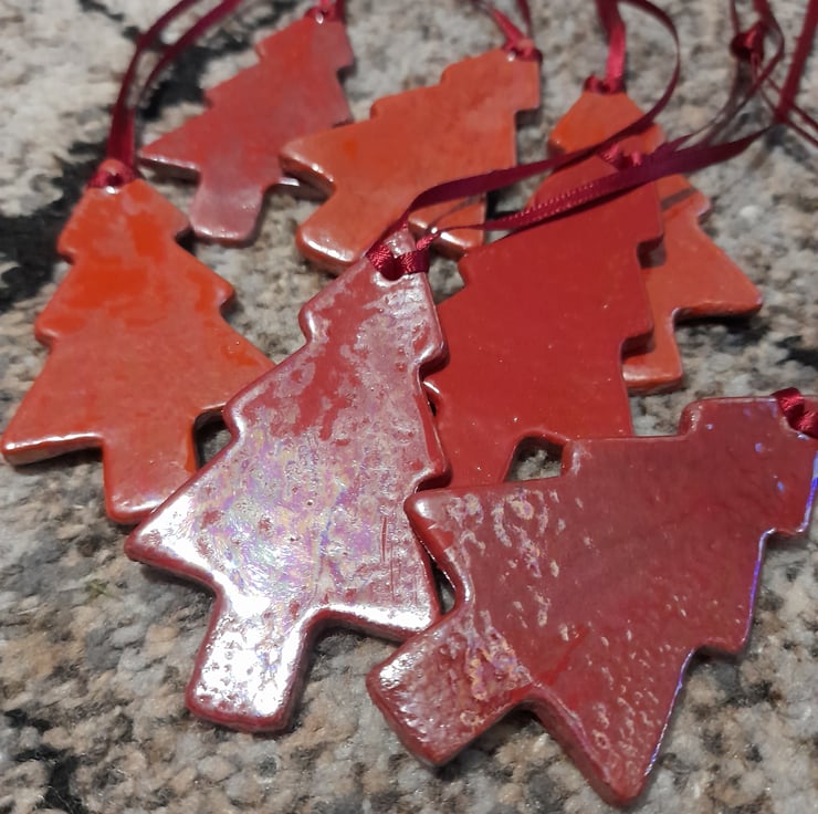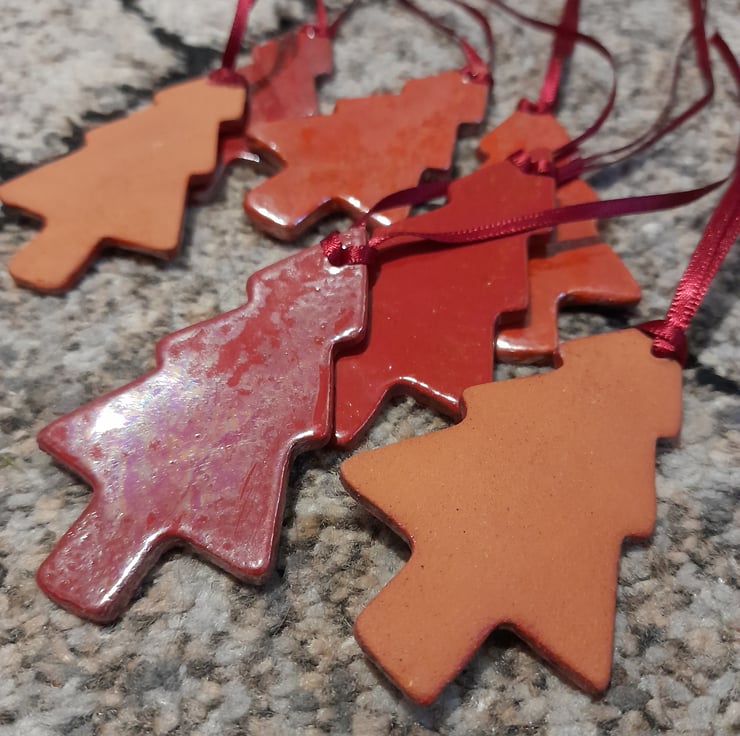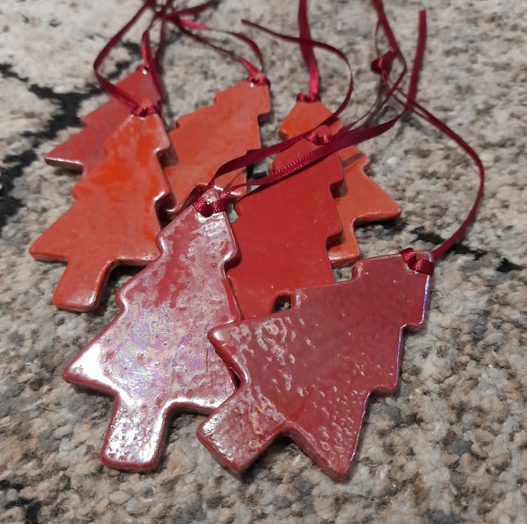 Red handmade ceramic christmas tree hanging decoration. Terracotta clay used with shiney Red glaze, not glazed on the back. Red ribbon for hanging, 5cm by 2cm approx.
