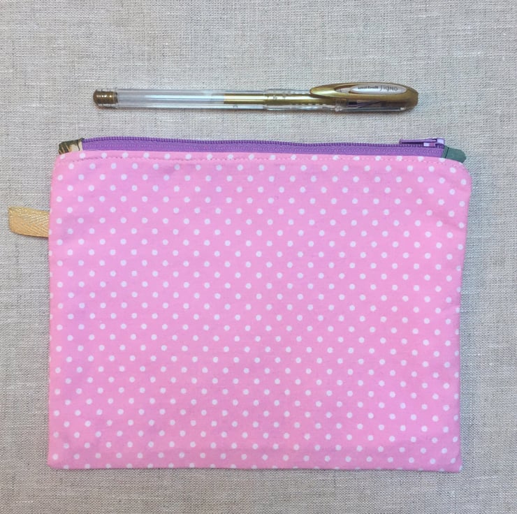The back of the case is a light pink fabric with white dots. The zipper is lilac. The lining of the case is white cotton.