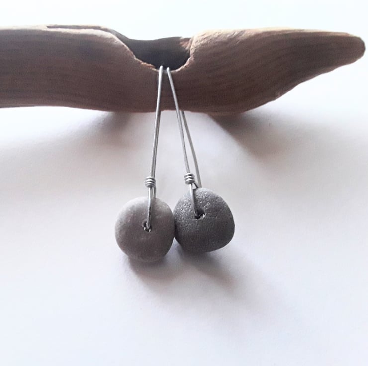 The pebbles are approximately 1cm by 1cm. They are attached to handmade, stainless steel earwires, with long backs.