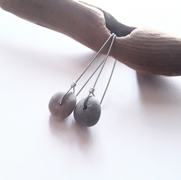 Two beautifully tactile beach pebbles have been hand-drilled to make up these contemporary minimalist pebble earrings.