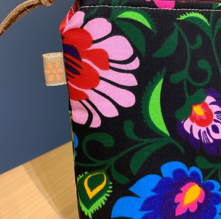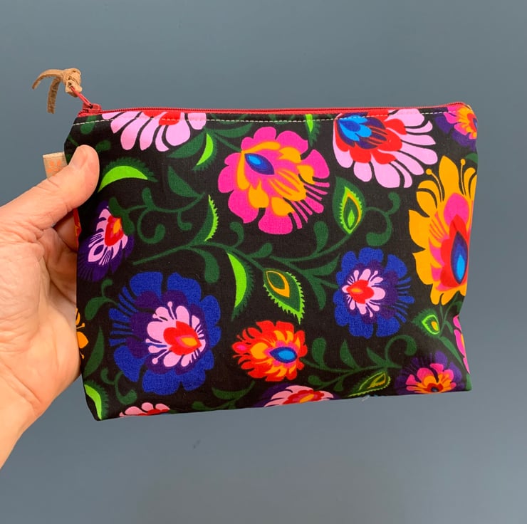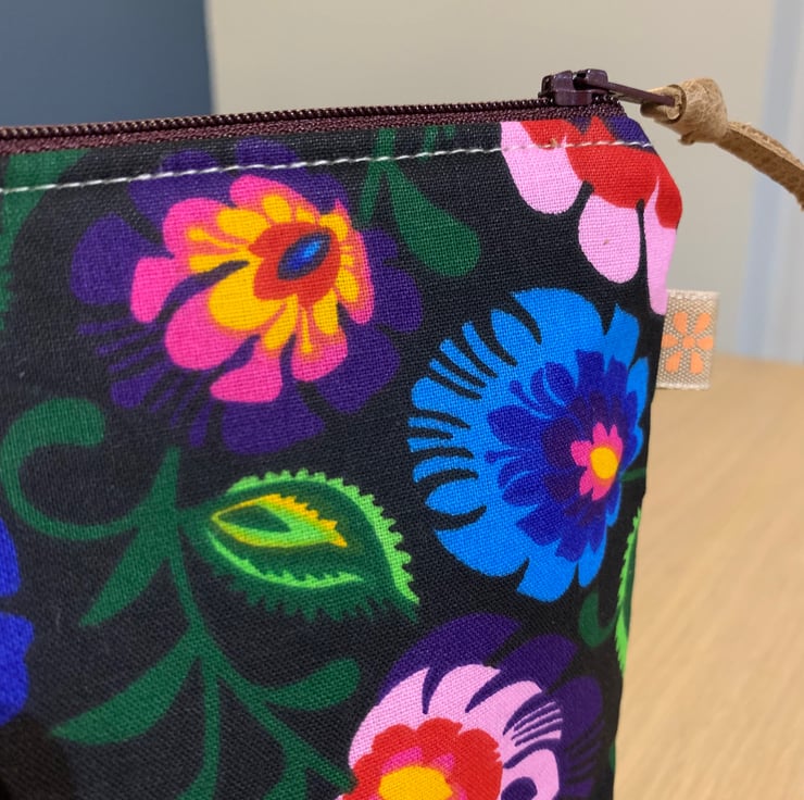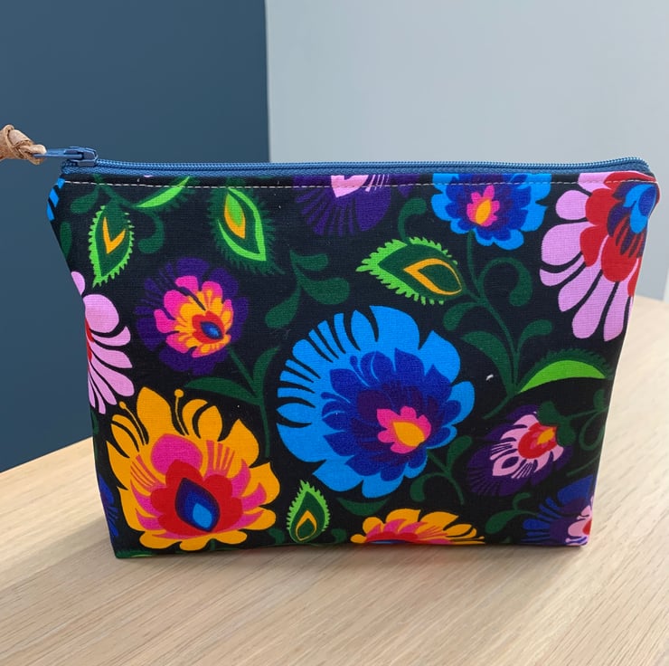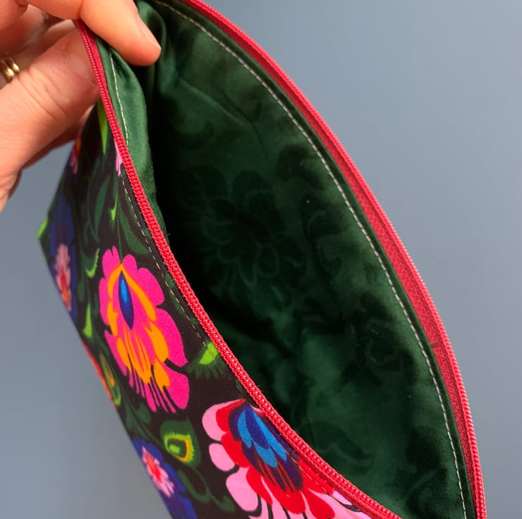 Colourful floral cotton zip pouch lined with dark green Laura Ashley fabric. There is a layer of interfacing to give the bag a bit of body.