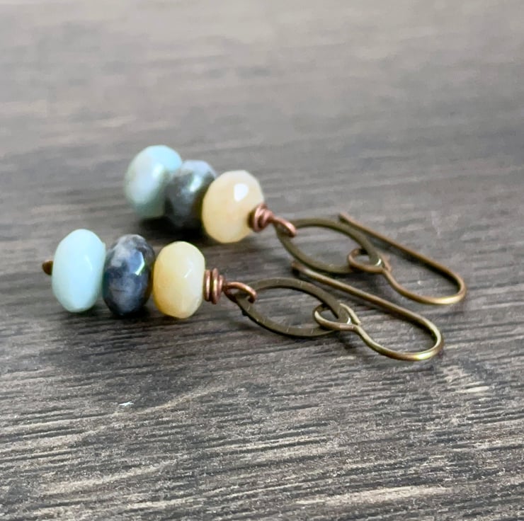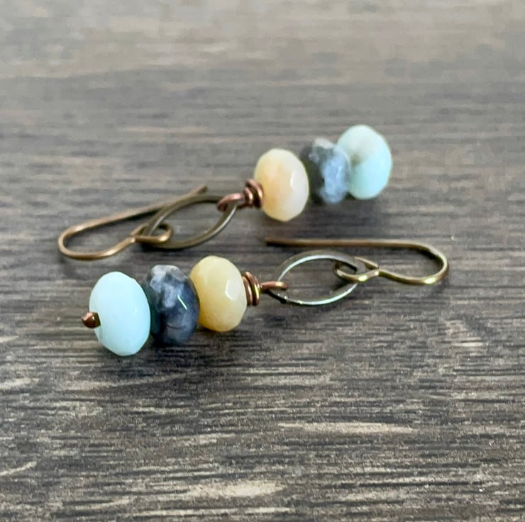 The trio of beads have been simply stacked onto a copper ball headpin and dangle from solid brass cats eye connectors, which have been hand antiqued by Patina Queen in the USA.