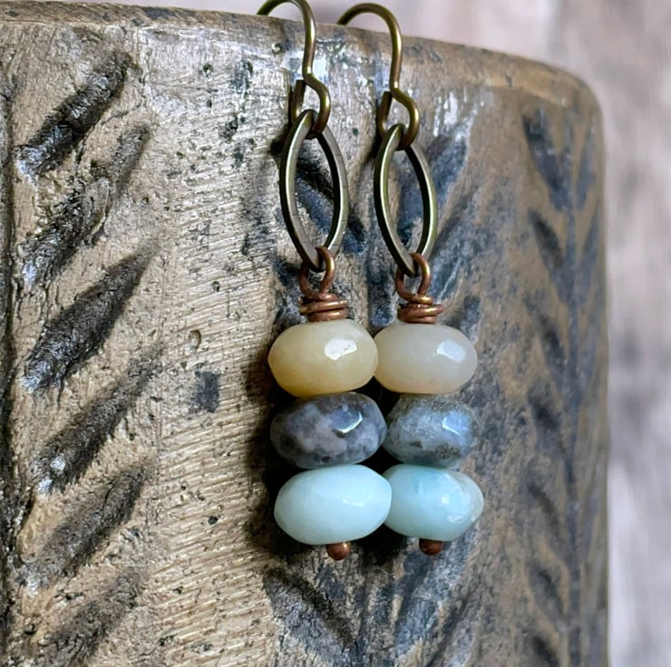Delicate pair of gemstone earrings featuring natural faceted Amazonite beads. The beautiful multi-colour stones are all slightly different in soft natural shades.