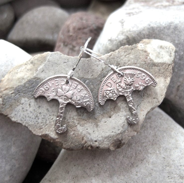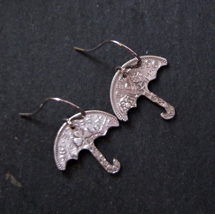Two 1965 sixpences cut into the shape of umbrellas and finished with sterling silver ear wires. Approximately 1.6cms long. Ideal fora 60th birthday present.