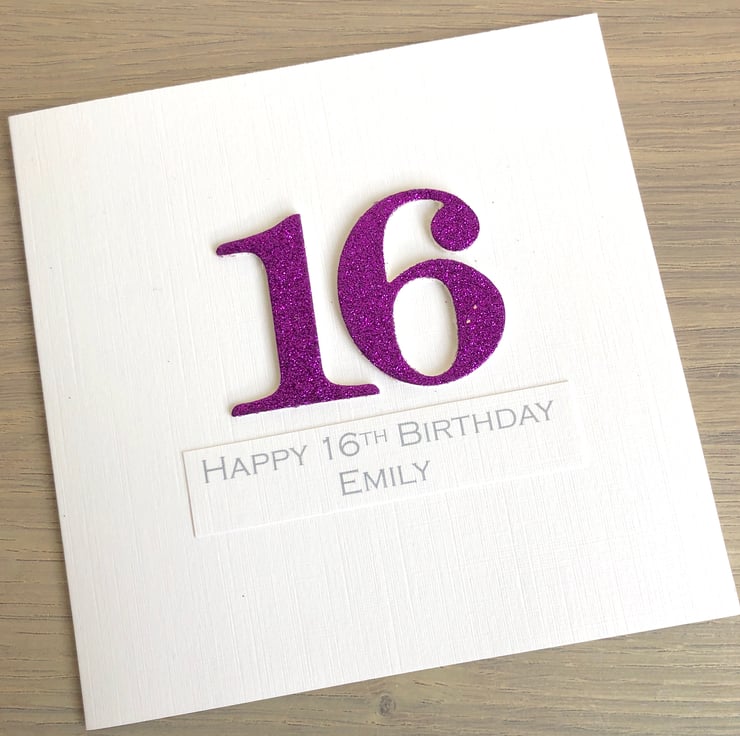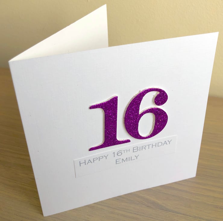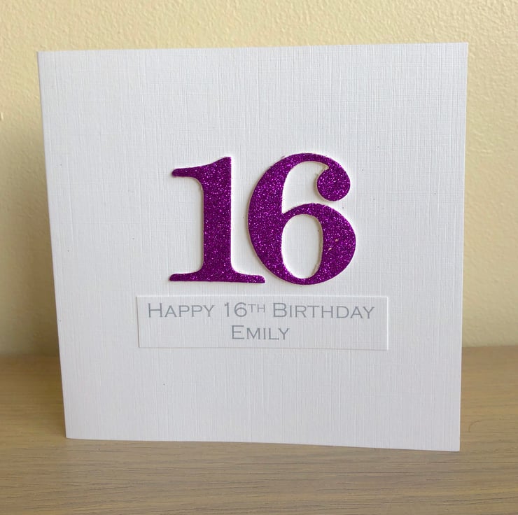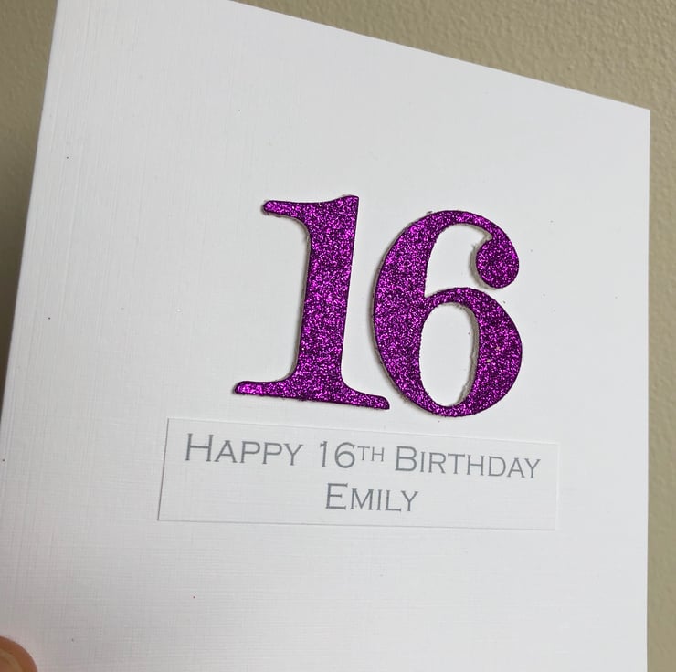 Featuring the number "16" die-cut from glitter card, with a personalised printed message.