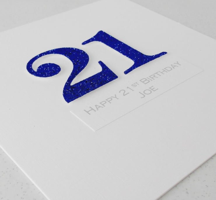 Featuring the number "21" die-cut from royal blue glitter card, with a personalised printed message.
