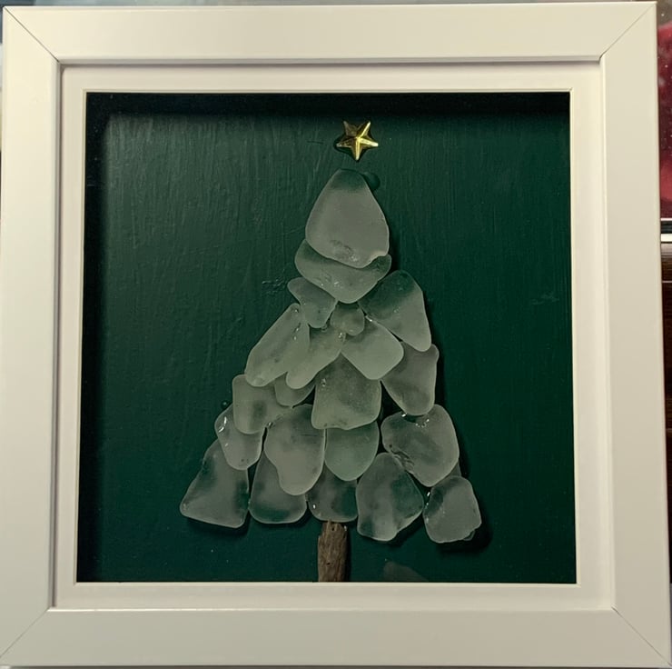 This seaglass tree is made with white seaglass collected from Withernsea beach, East Yorkshire, and is mounted on a dark green painted back drop in a 20.5cm (8 ins) square 3D glass fronted frame. A piece of driftwood forms the tree trunk and a gold star tops the tree. Ideal for Christmas or any time of year for a unique decoration to your room.