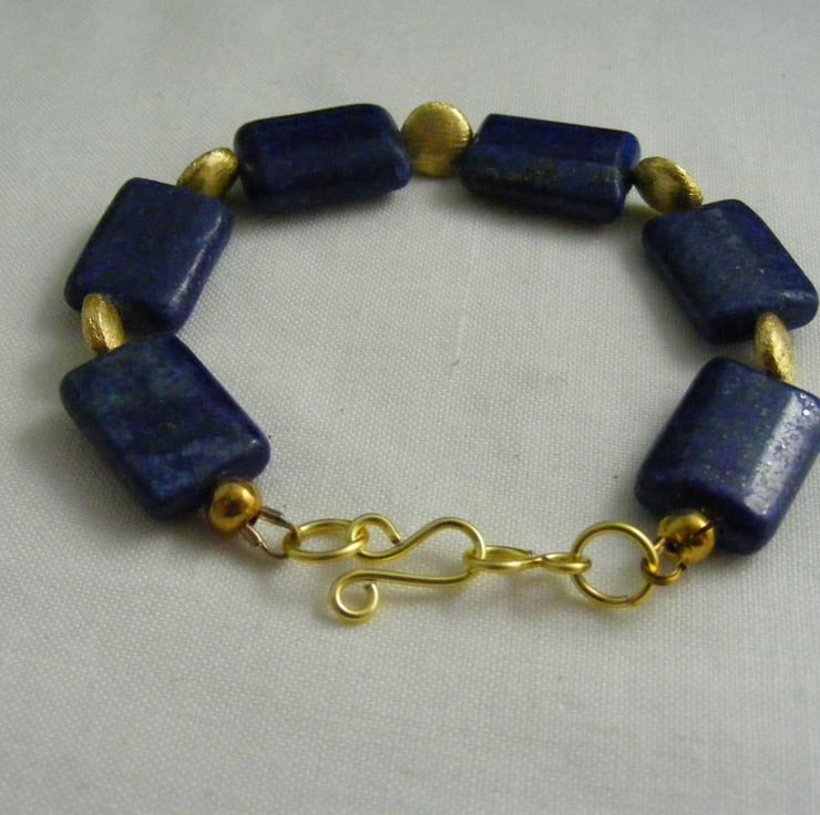 Gemstone bracelet is handmade with, 18 x 13 mm lapis rectangles which are threaded on beading wire with, 7 mm gold brushed coin spacers. Wire ends are finished with gold plated findings. Gold plated clasp is handmade.