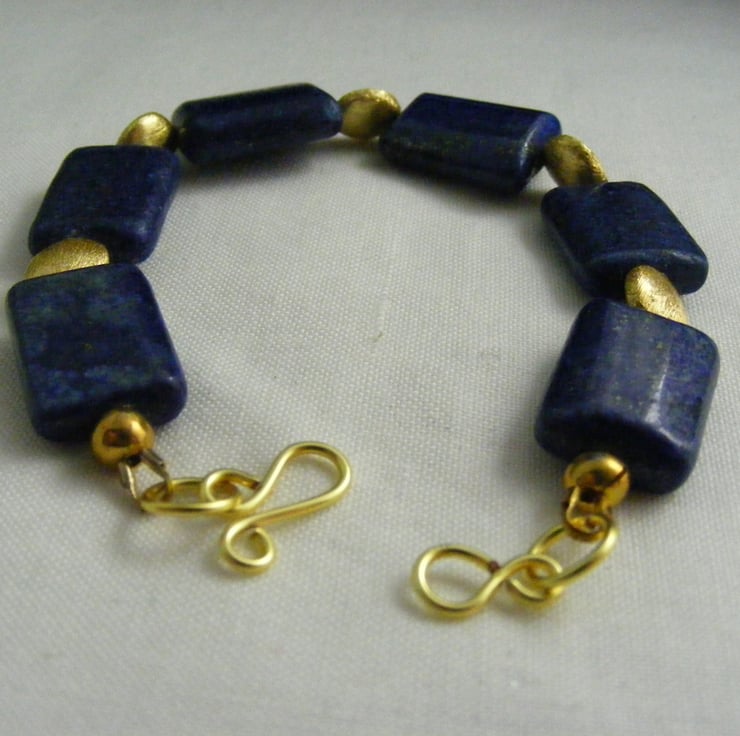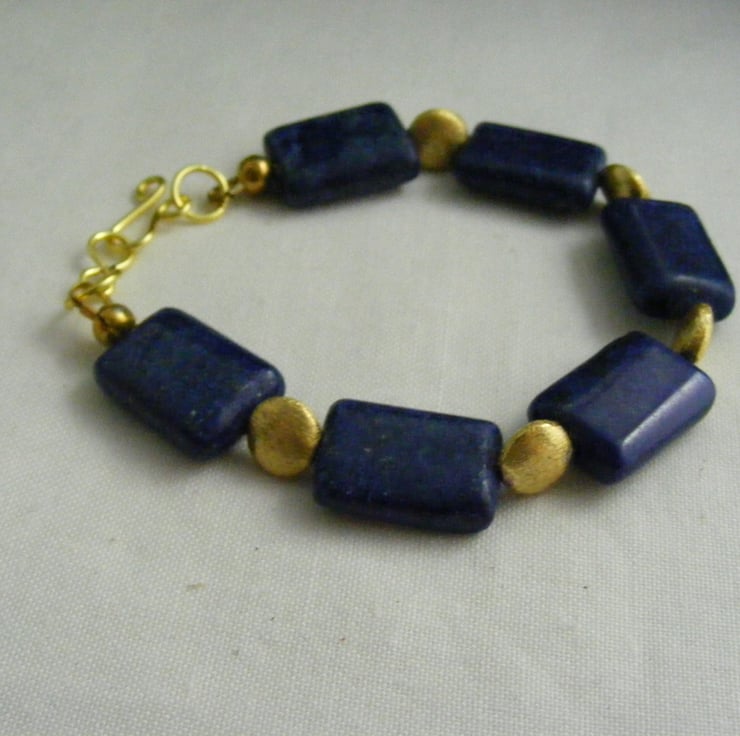 Gemstone bracelet is handmade with, 18 x 13 mm lapis rectangles which are threaded on beading wire with, 7 mm gold brushed coin spacers. Wire ends are finished with gold plated findings. Gold plated clasp is handmade.