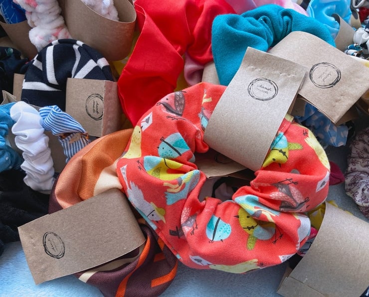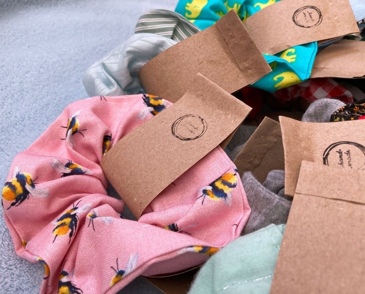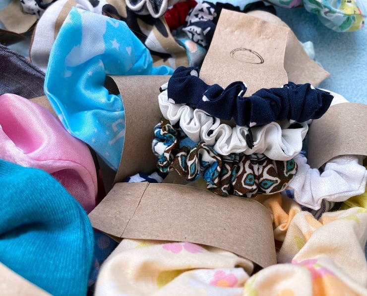 These scrunchies are eco-friendly, using up the remnants and scraps from other projects. Excited for them to go to a loving new home!
