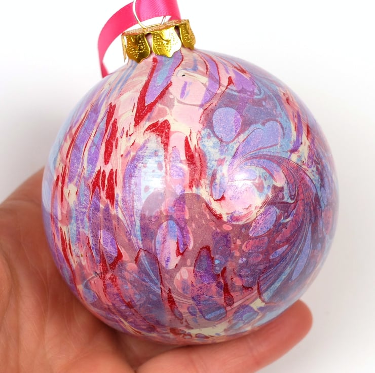 Another of my double marbled unique pieces with pink, purple, red and blue all layered together providing lots of interest and texture. every part of the bauble is different and with no front or back to the design it will look beautiful viewed from every angle.