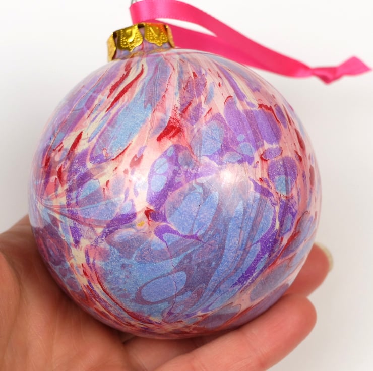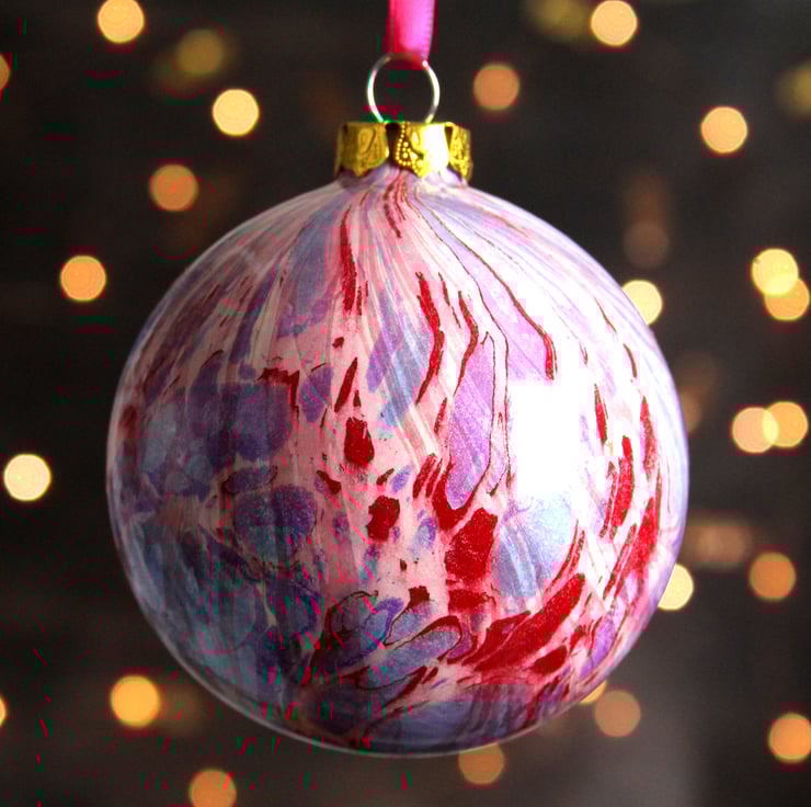 Another of my double marbled unique pieces with pink, purple, red and blue all layered together providing lots of interest and texture. every part of the bauble is different and with no front or back to the design it will look beautiful viewed from every angle.