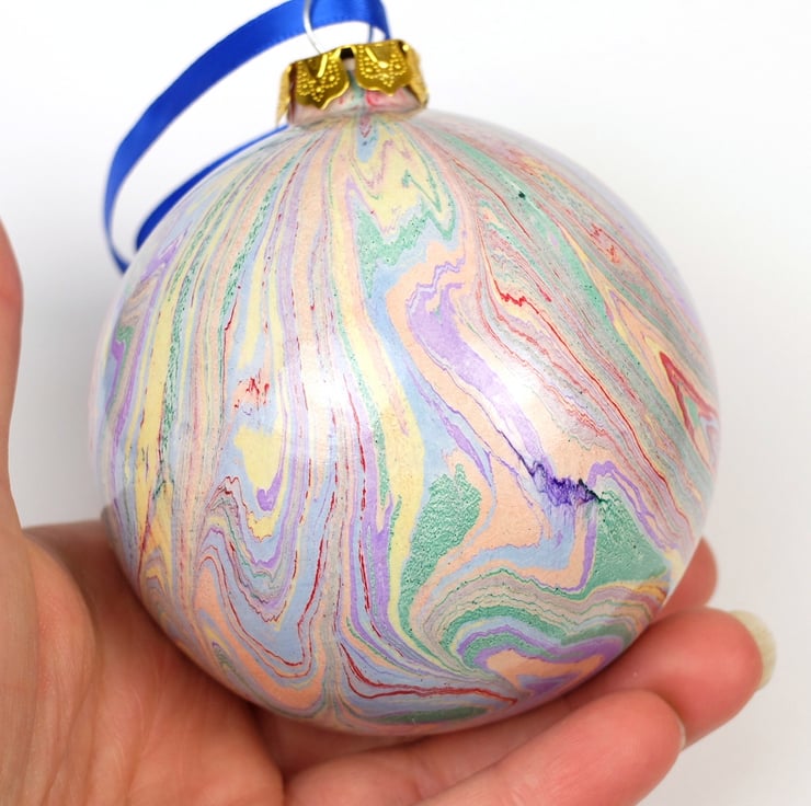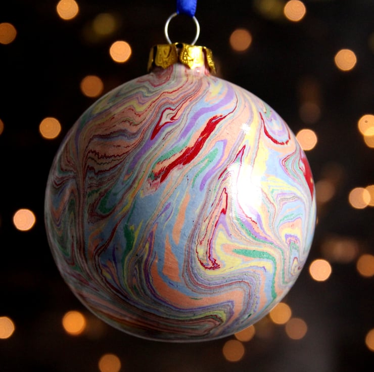 One of my popular rainbow baubles in my 'rainbow agate' pattern where thin bands of rainbow colours wiggle their way over and around the surface.
