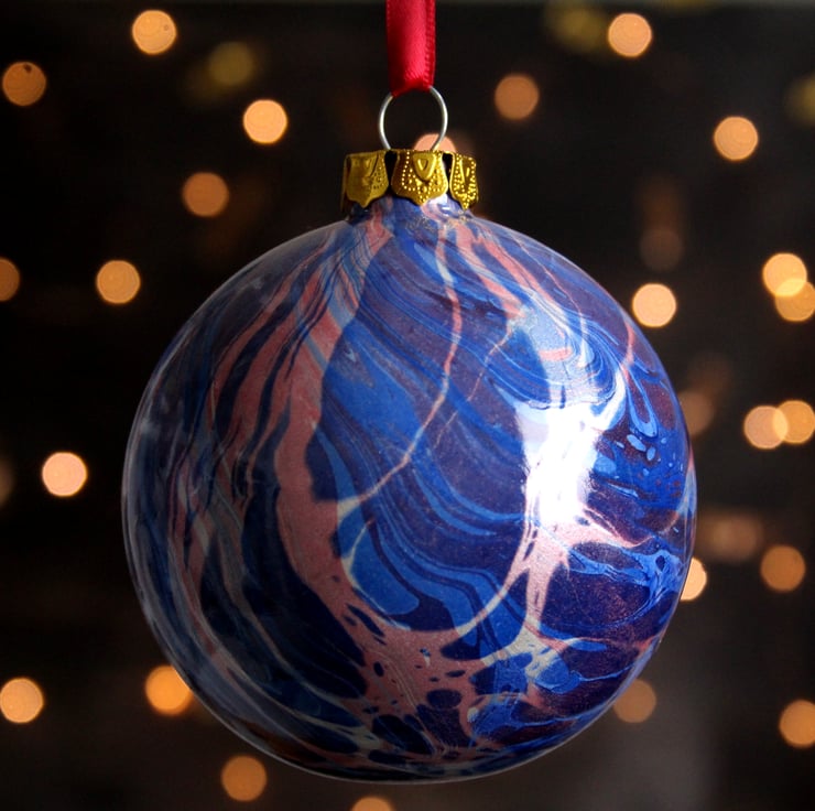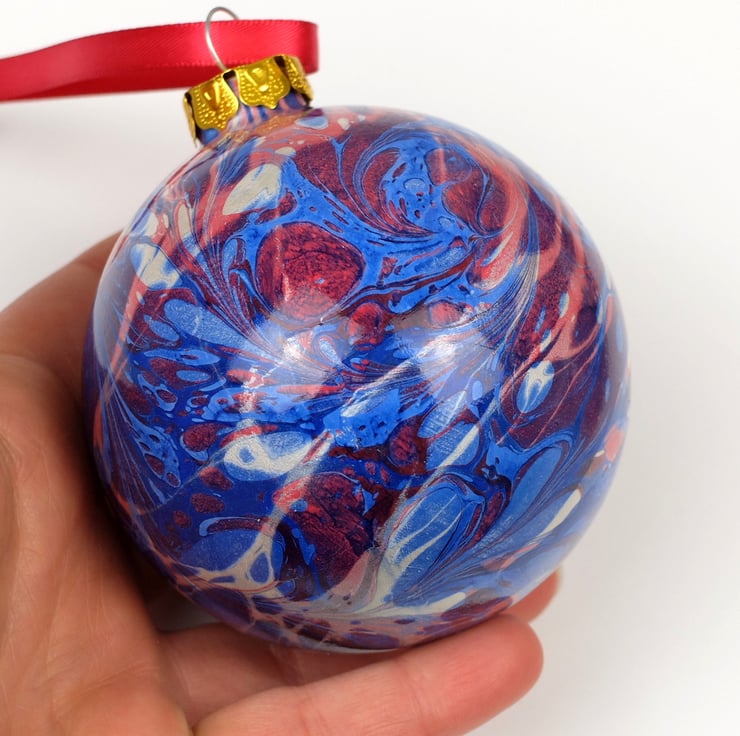 A beautiful double marbled luxury ceramic bauble in blue, red and silver with a lovely layered effect with ribbons of colour curving around the bauble.