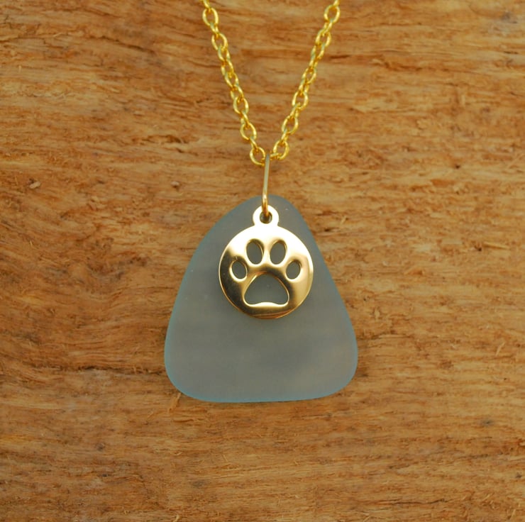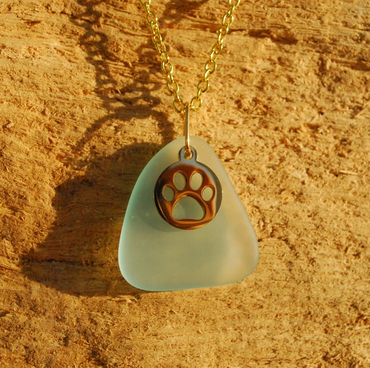 We love paw print charms because they express our love of animals. The tumbled beach glass we've used behind the charm to make this pendant is an unusually beautiful shade of aquamarine, which looks lovely with the golden charm.