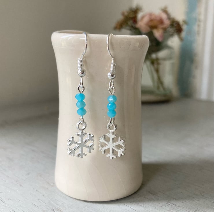 Festive earrings made with silver-plated snowflakes, ice blue sparkle beads and silver-plated earring hooks. The earrings are approximately 4cm in length including the hook. Available in other bead colours - please ask if you would like a colour not listed.