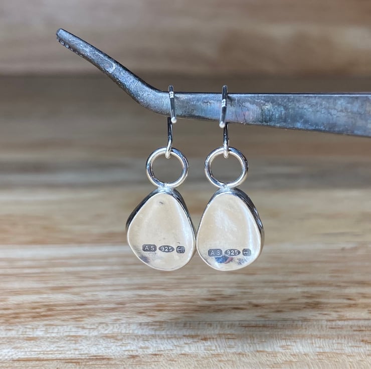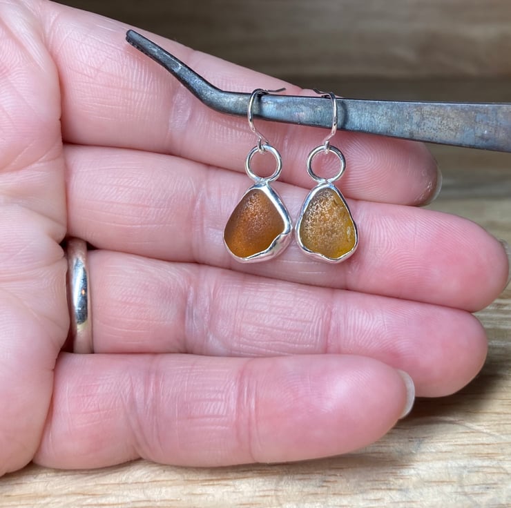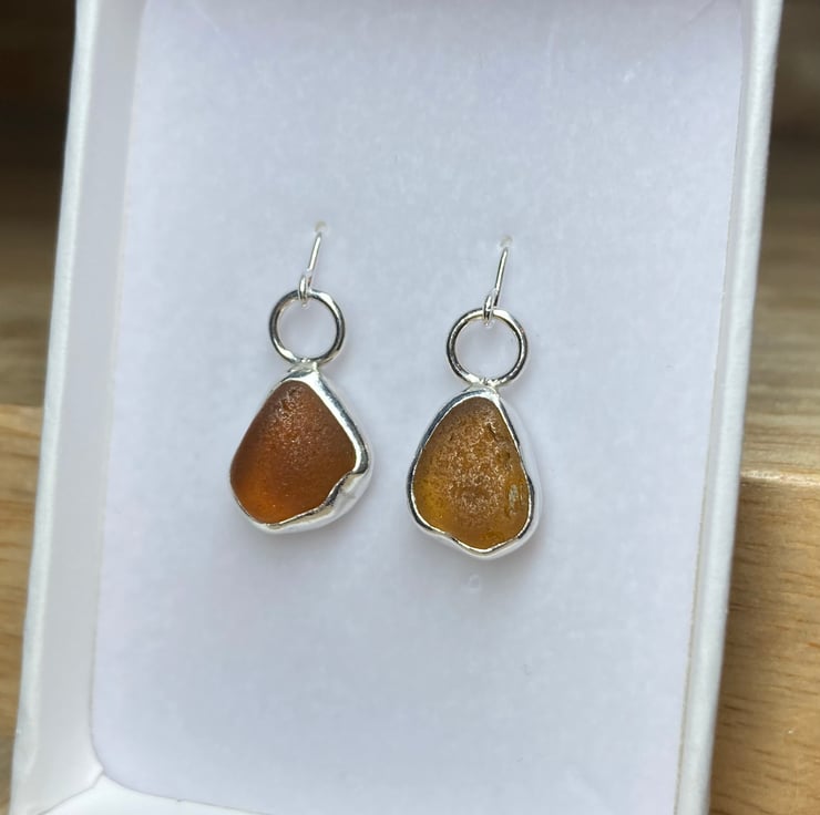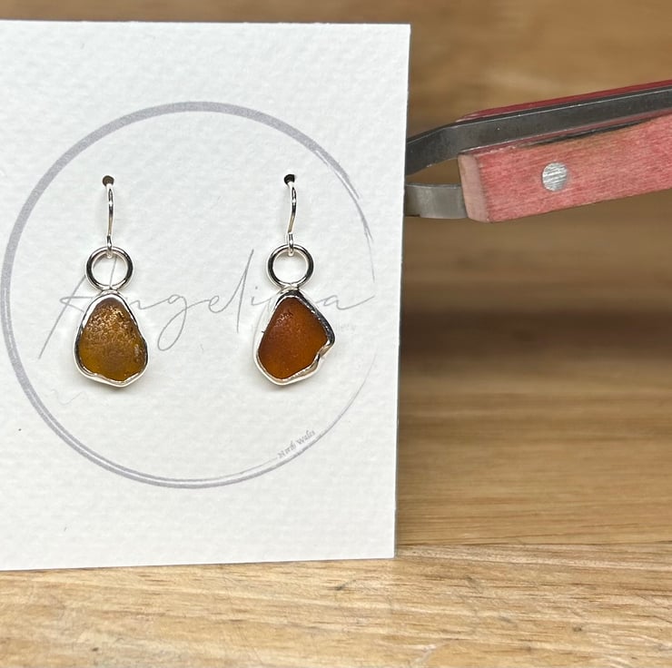Gorgeous handmade sterling and fine silver dangle earrings with beautiful pieces of amber coloured welsh sea glass collected from a North Wales beach. These earrings are entirely unique and are sisters not twins! The glass shines different shades in different lights, they are simply stunning. Both earrings have been officially hallmarked at the Assay Office for authenticity of the precious metals. Will come in a lovely white jewellery box which will be wrapped with twine and lavender.