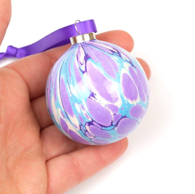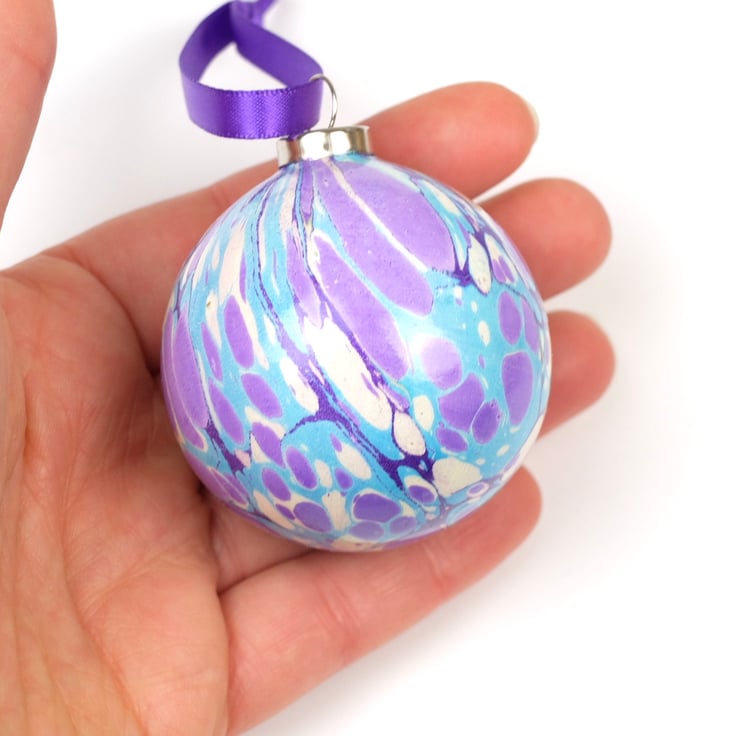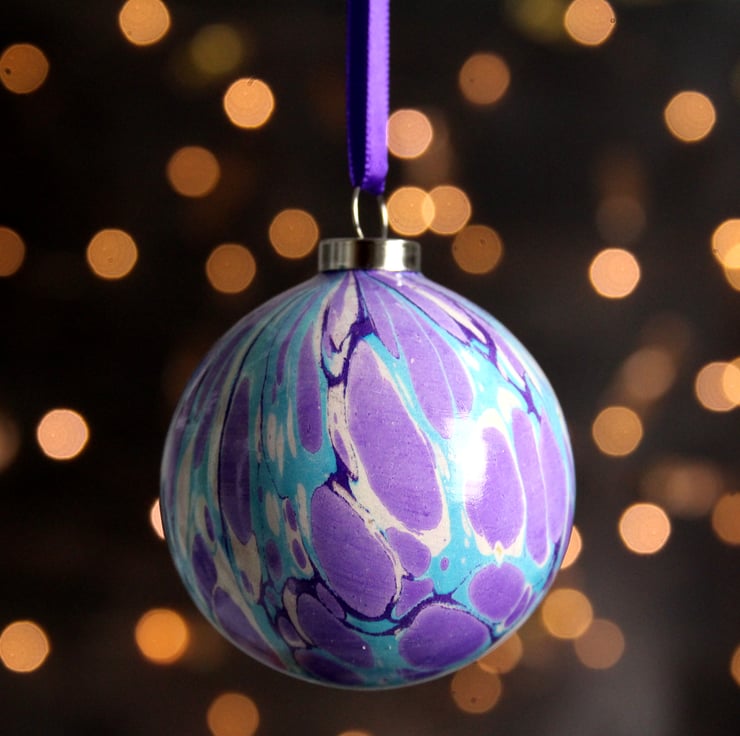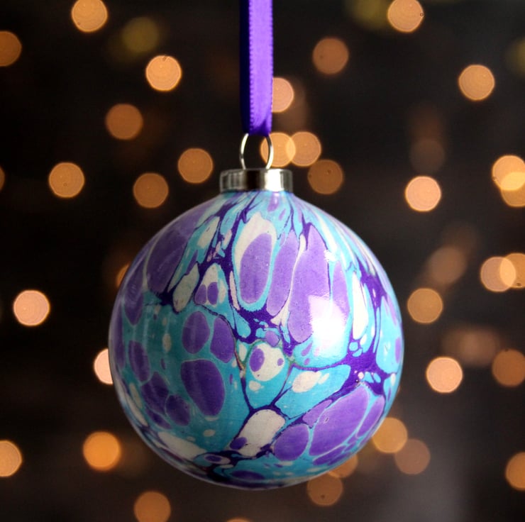 The baubles in this range are marbled directly onto the ceramic surface - a technique which is much more difficult than it sounds! Each bauble is marbled from a different bath, so they are all different and totally unique. They are lots of fun to make and totally addictive!
