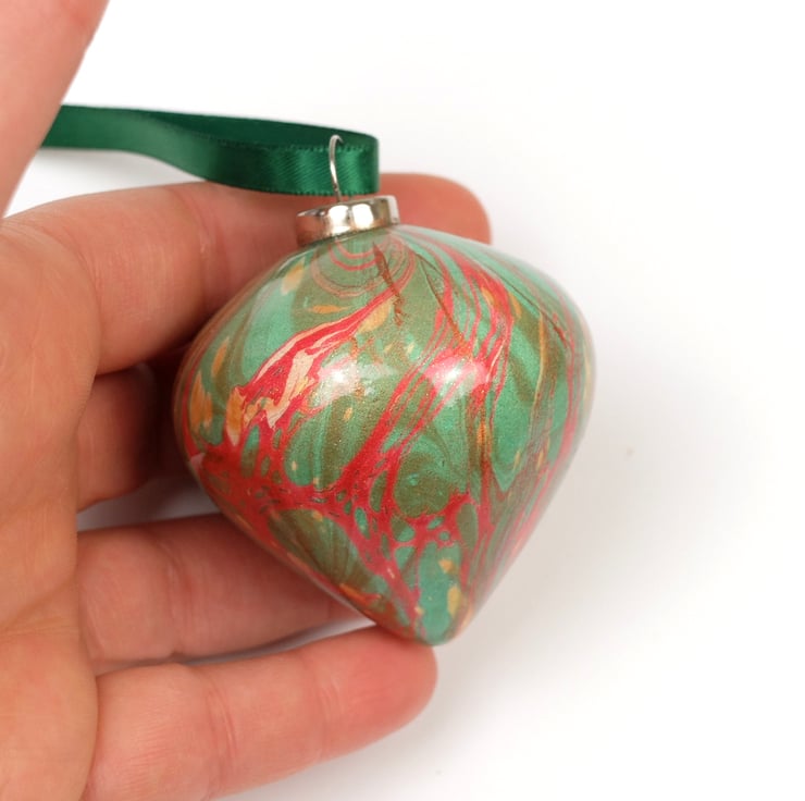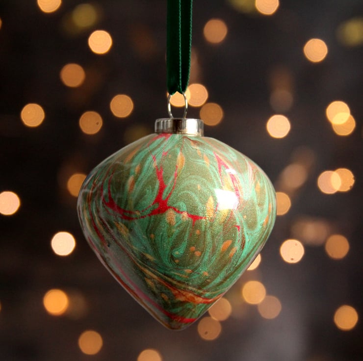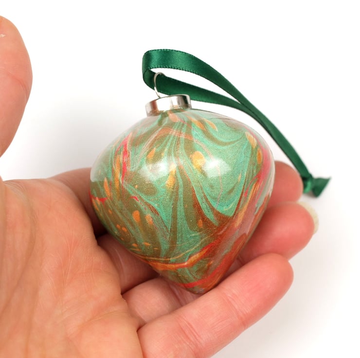Bright red, green and gold swirl around this lovely and festive double marbled ceramic bauble.