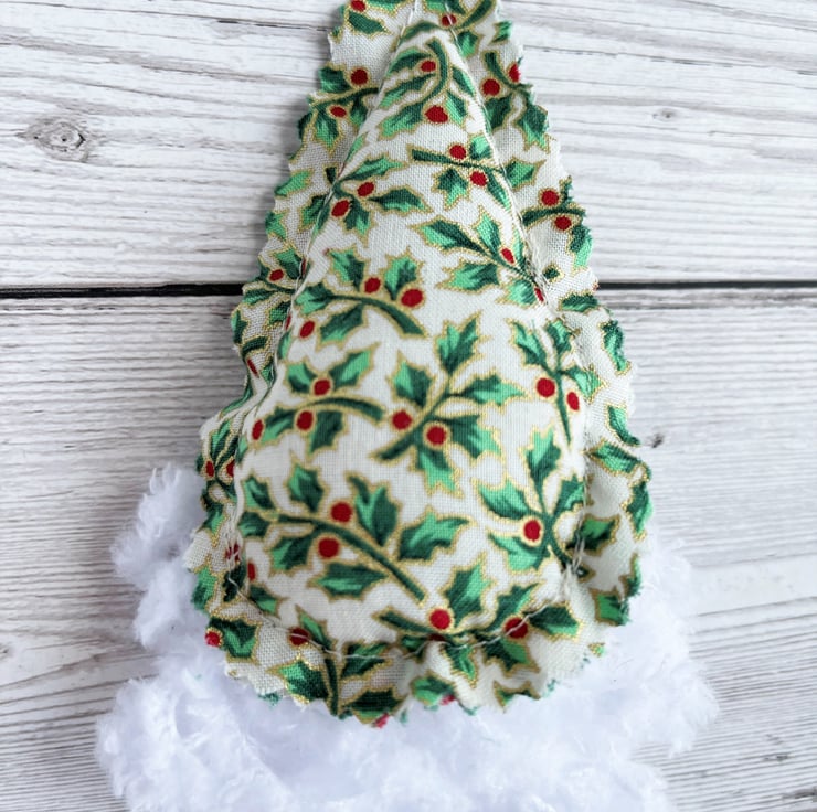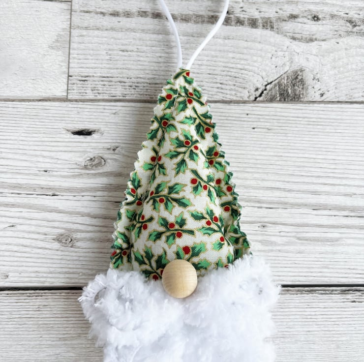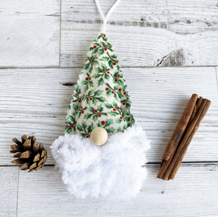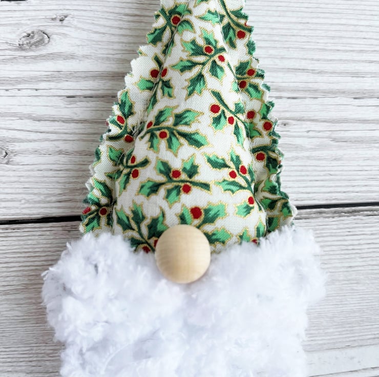 Cream gnome hanging Christmas decoration. This cute little Scandi gnome decoration has a hat of cream fabric with a print pattern of holly and berries in green, red and gold. He has a beard made from white snuggly chunky yarn, and a natural wood bead nose. The fabric has pinked edges to give a raw scalloped finish to the hat. The decoration is lightly padded with polyester hollow fibre filling and has a hanging loop made from white satin cord.