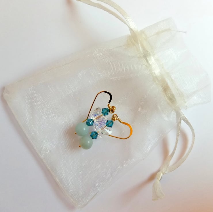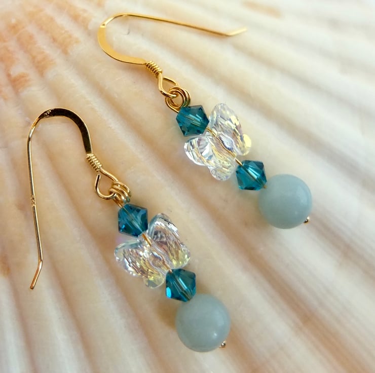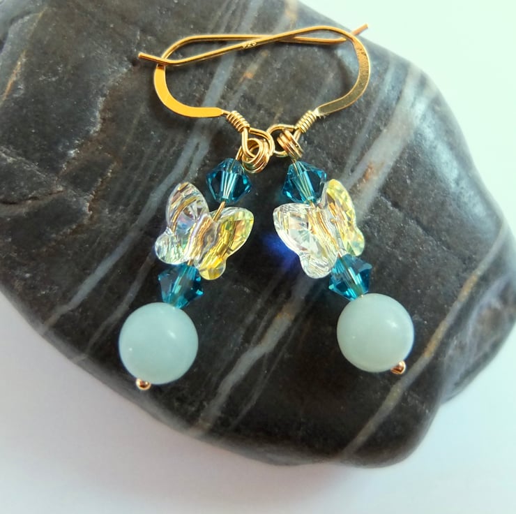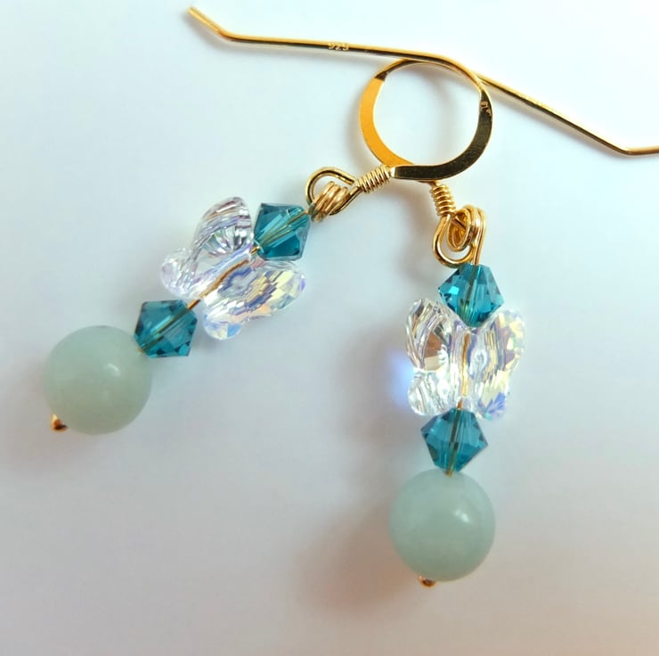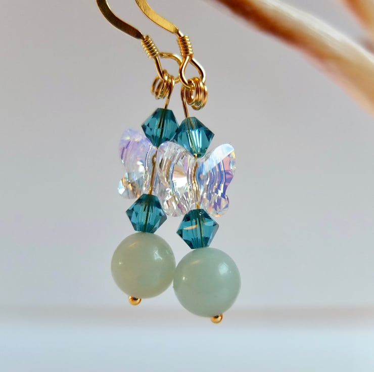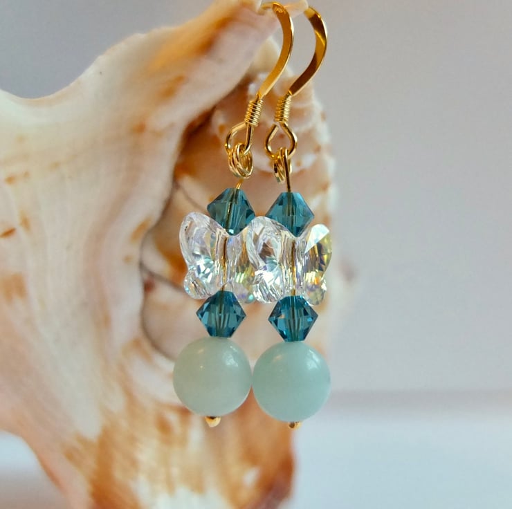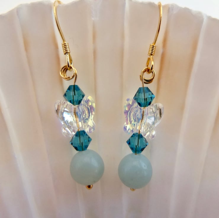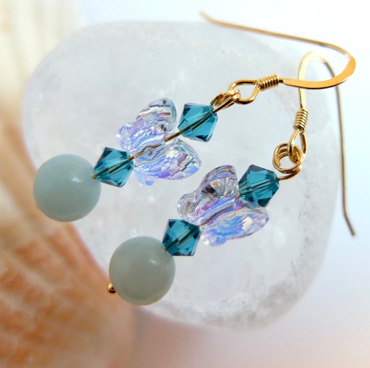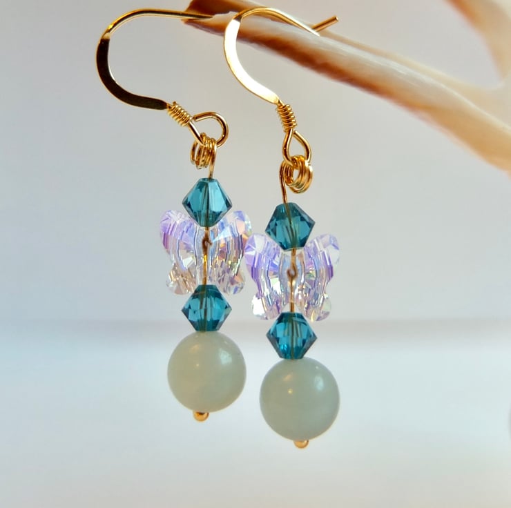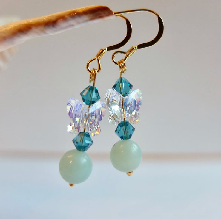 Super-sparkly Swarovski crystal AB butterfles, measuring approximately 8mm, bracketed by Swarovski "indicolite" 4mm bicones and set above a 6mm pastel blue-green amazonite bead.