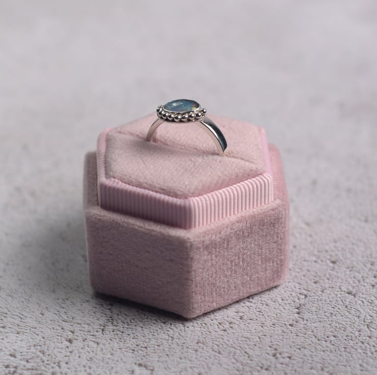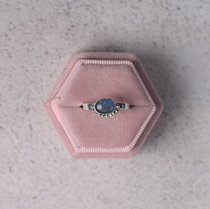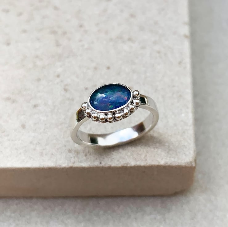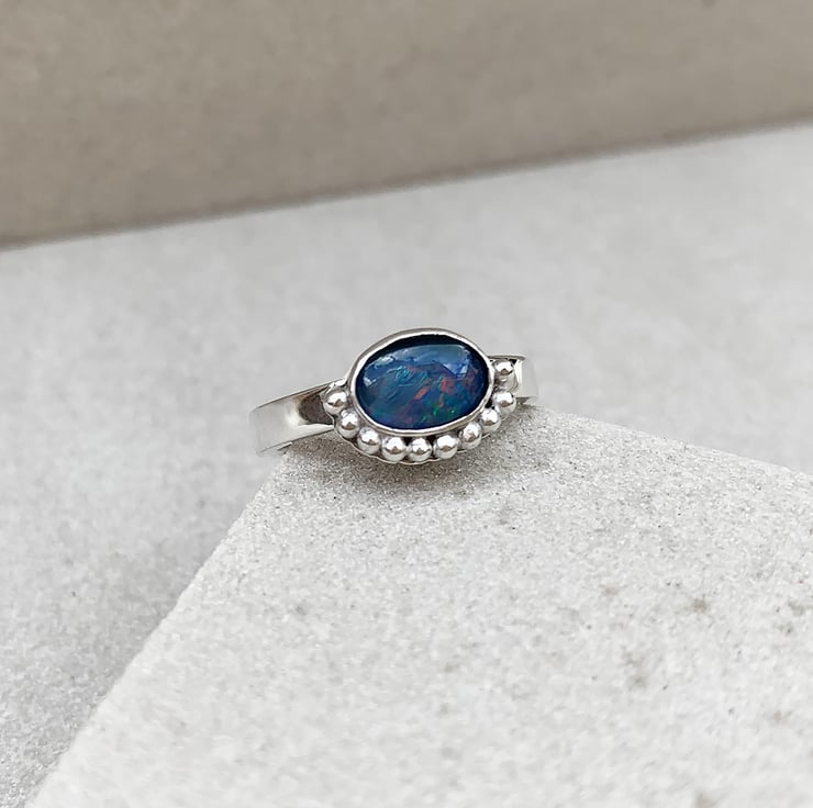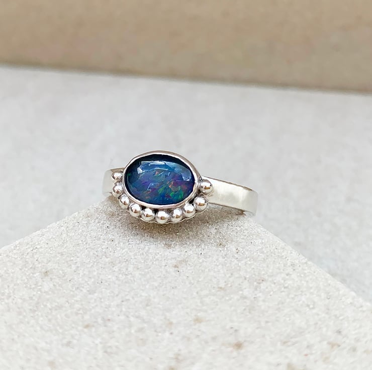 This beautiful 'Zia' ring features an oval opal gemstone and silver granulated balls.