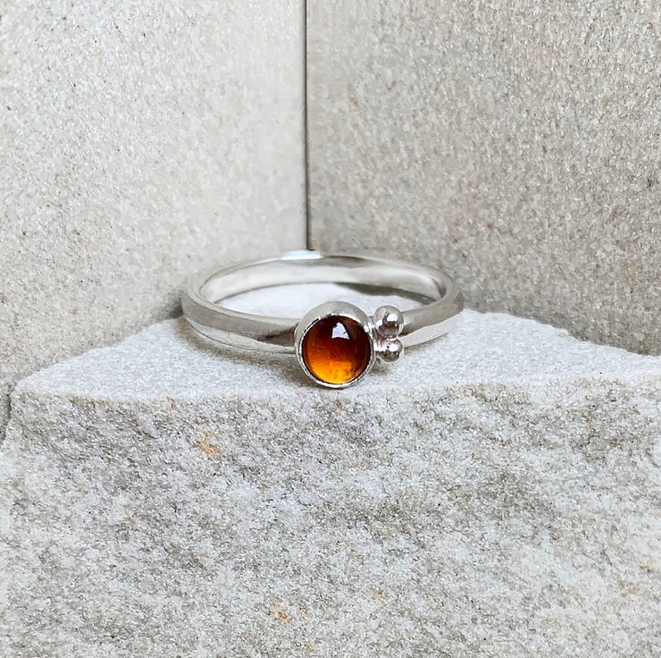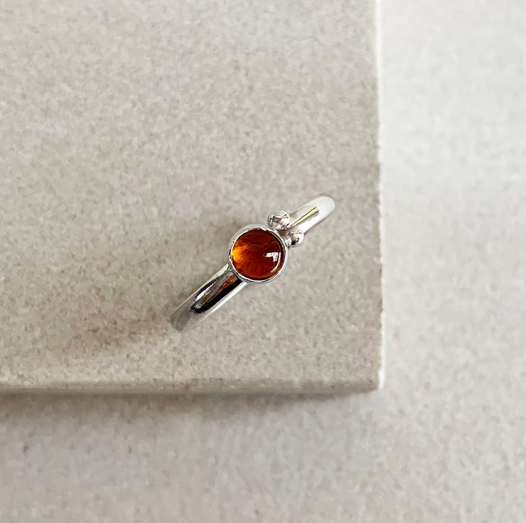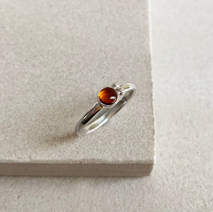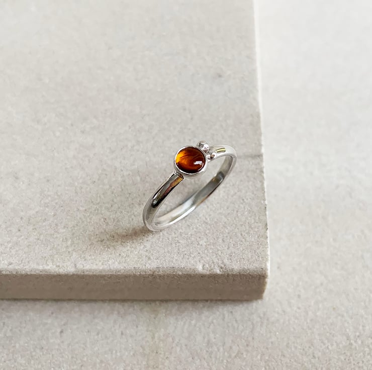 This ring is perfect to wear on it's own or stacked with other rings. The band is 2.3mm wide and 1.5mm thick. The amber gemstone is 5mm in size.