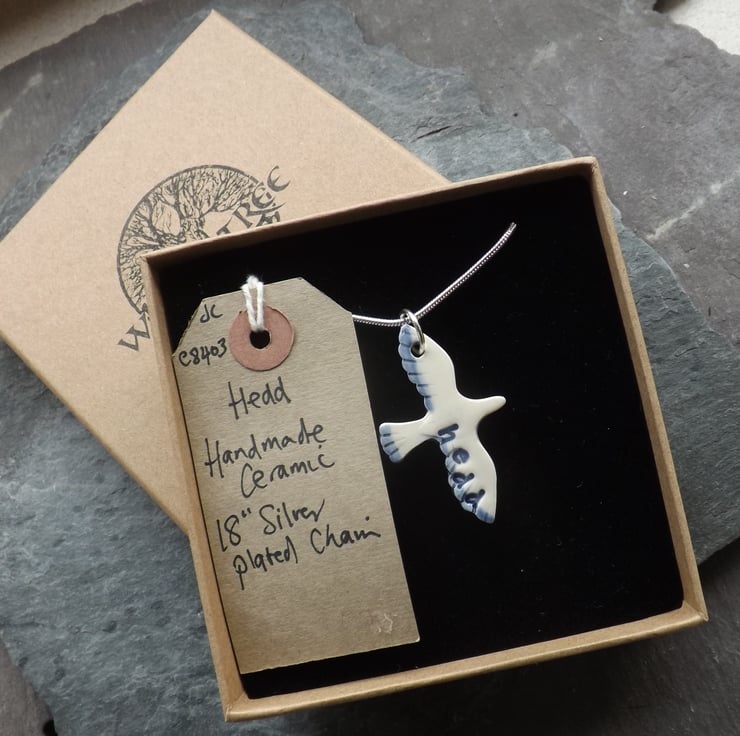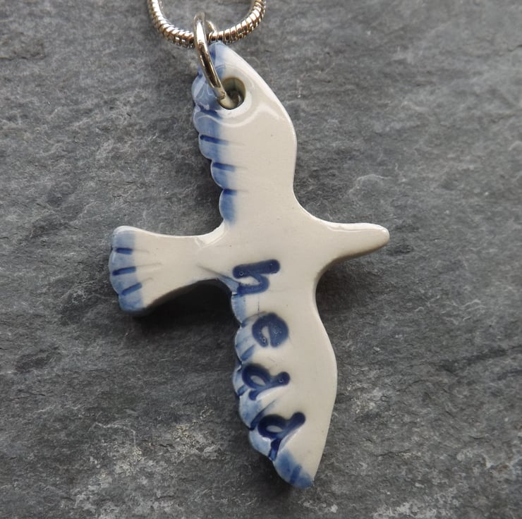 This ceramic bird pendant has 'Hedd', the Welsh word for peace, stamped into the wet clay. I have painted soft blue to highlight the wing edges and tail.