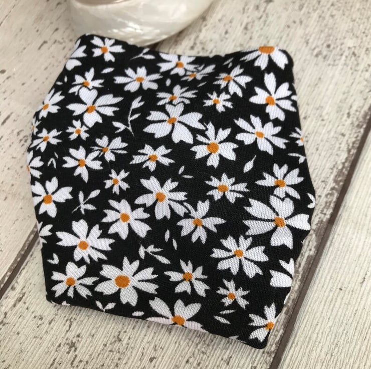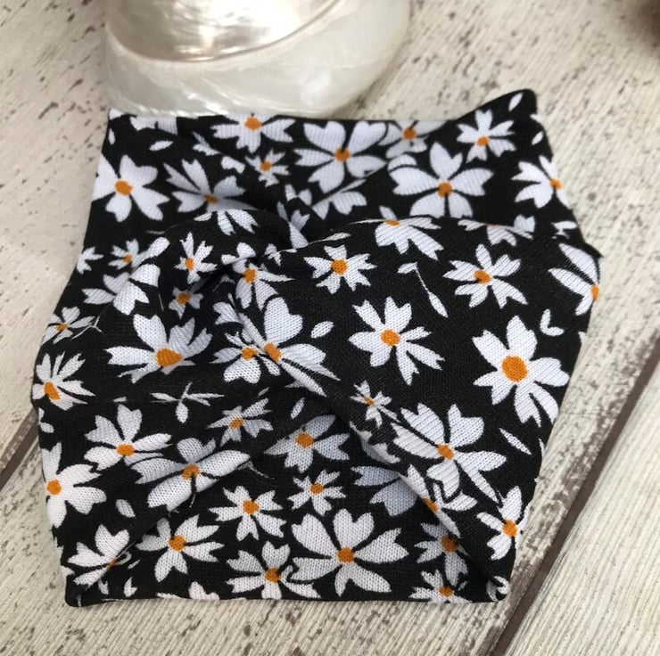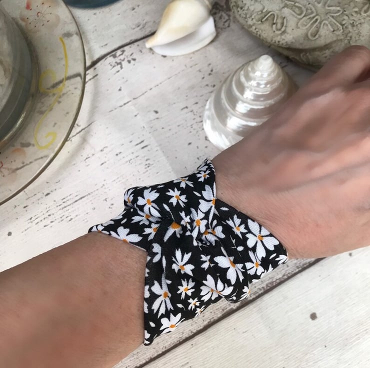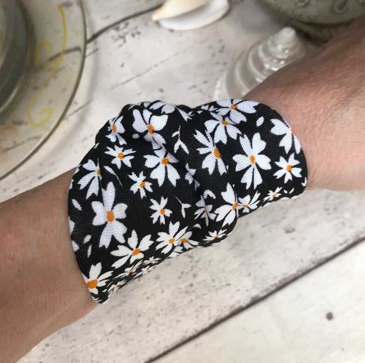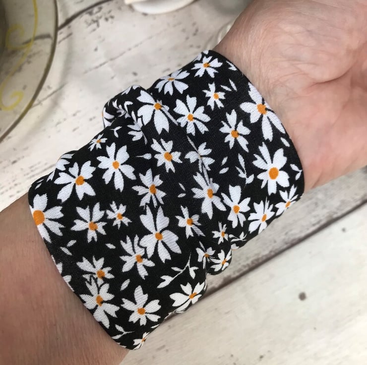 Cuff in a daisy slight stretch polyester print jersey. A lovely way to cover up marks or a tattoo on your wrist. A pretty bracelet for any day. And a great little gift idea.
