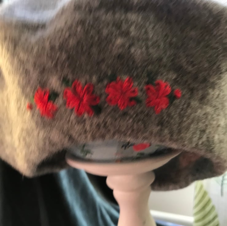 100% wool Grey Beret embellished with a group of red embroidered flowers, they are just random flowers as my needle lead me but they do look a bit like pretty red Daisies or at a stretch could be Poinsettia's. This is a trendy Grey Beret and the flowers in a striking red, group of daisy- Poinsettia look-a-like flowers with dark green leaves looks quite wintery-Christmassy