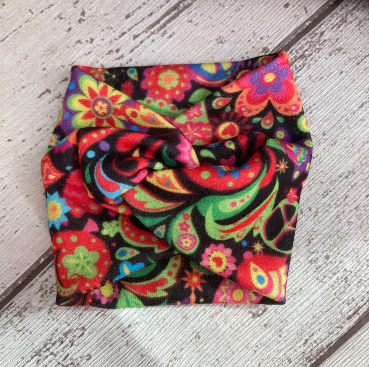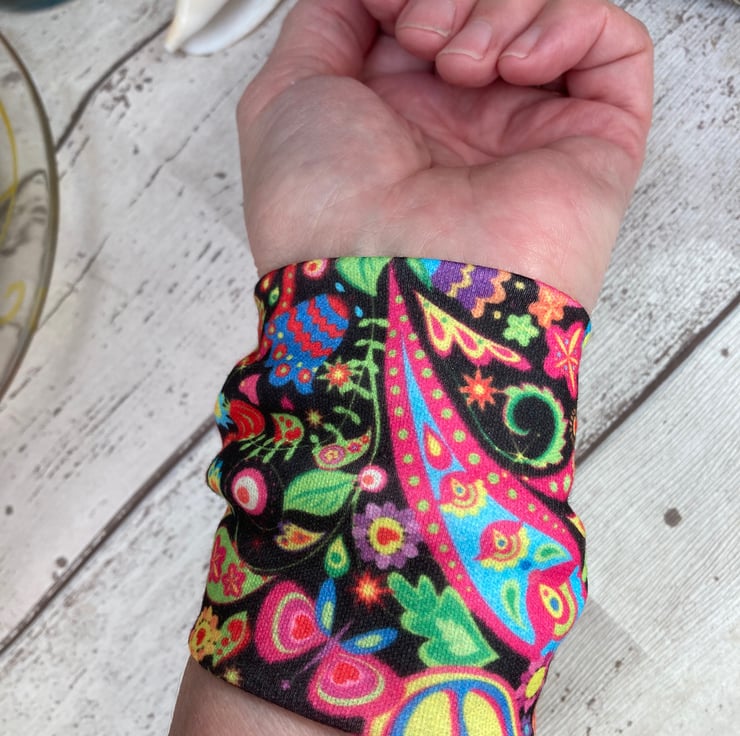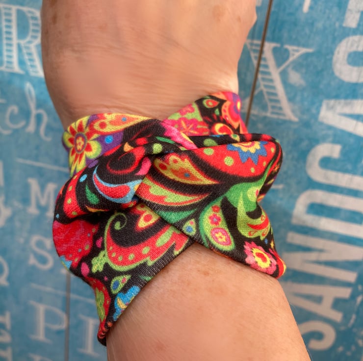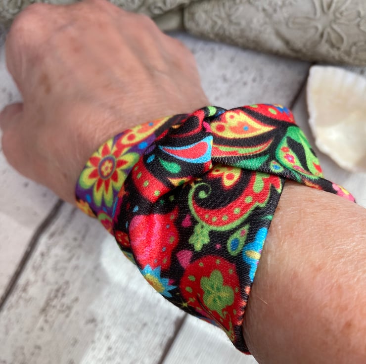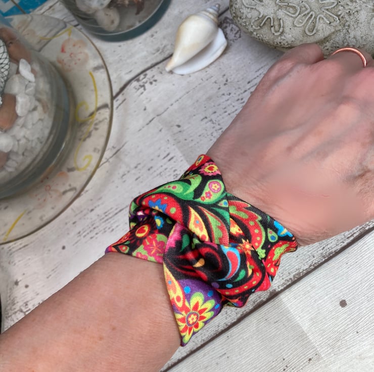 A gorgeous hippie colourful style wide wrist cover up twist bracelet. A multi design in lovely soft lightweight stretch polyester fabric.