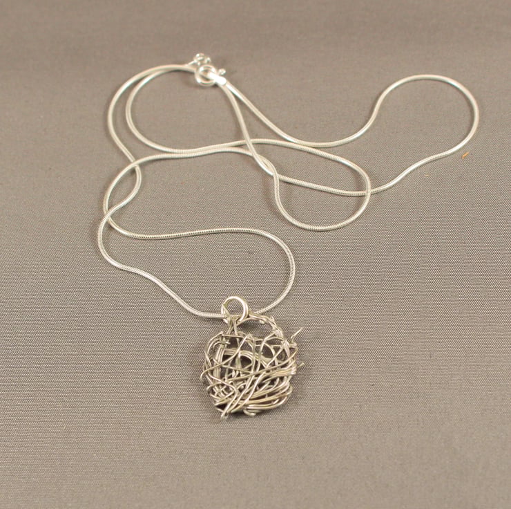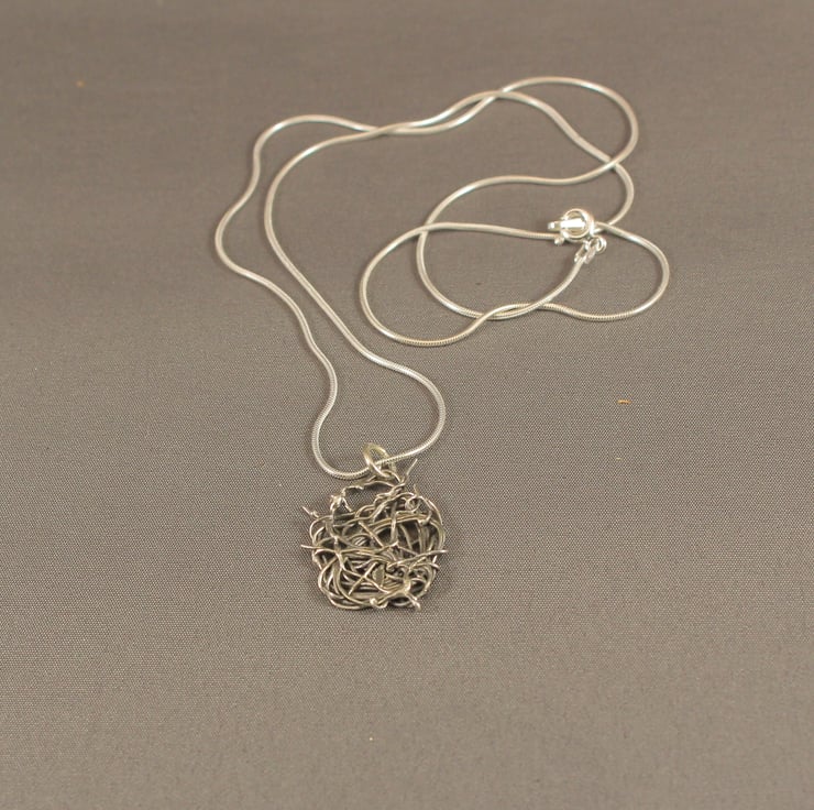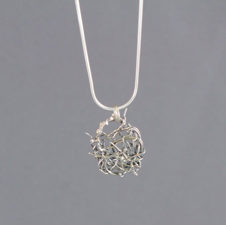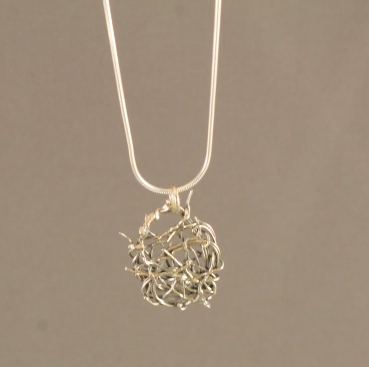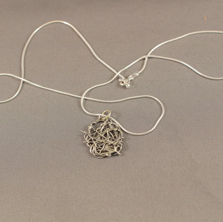 A little pendant made by tangling eco silver wire around itself and then fusing it with heat.