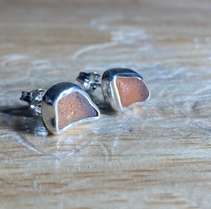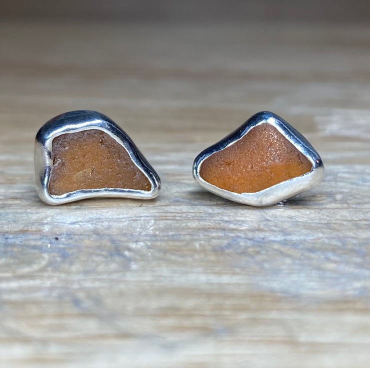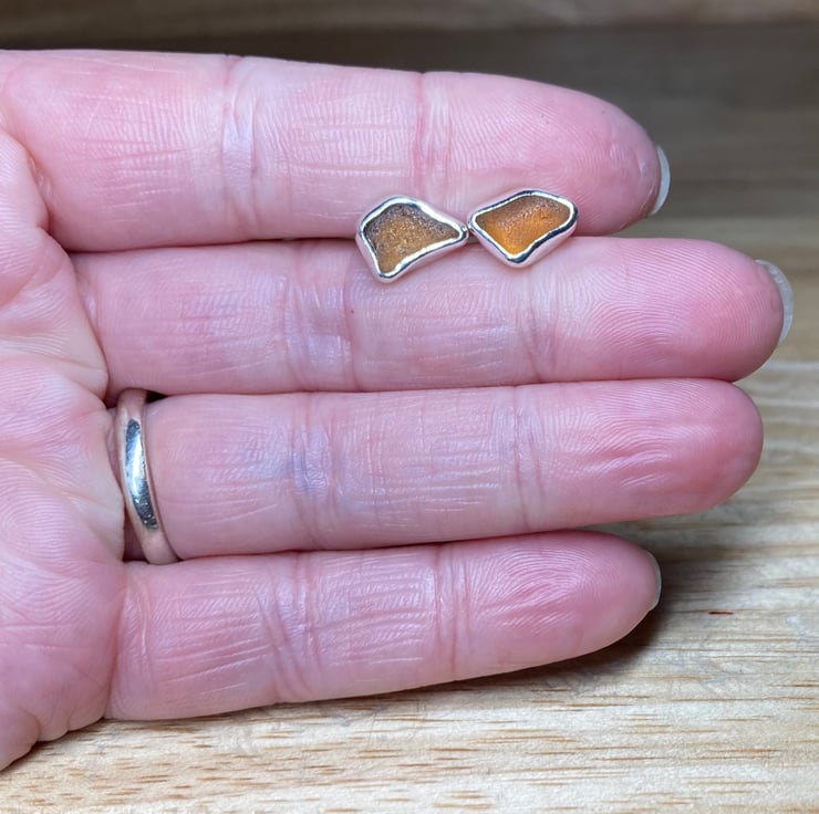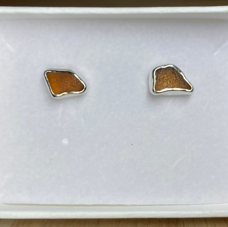 Gorgeous handmade sterling and fine silver stud earrings with beautiful pieces of amber coloured welsh sea glass collected from a North Wales beach. These earrings are entirely unique and are sisters not twins! The glass shines different shades in different lights, they are simply stunning.