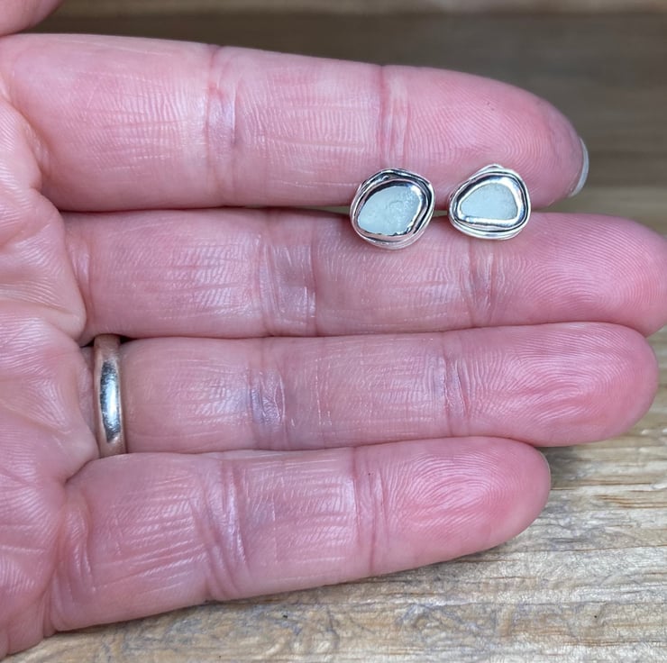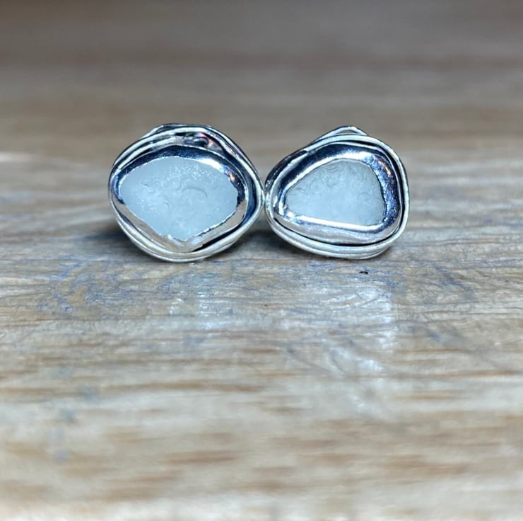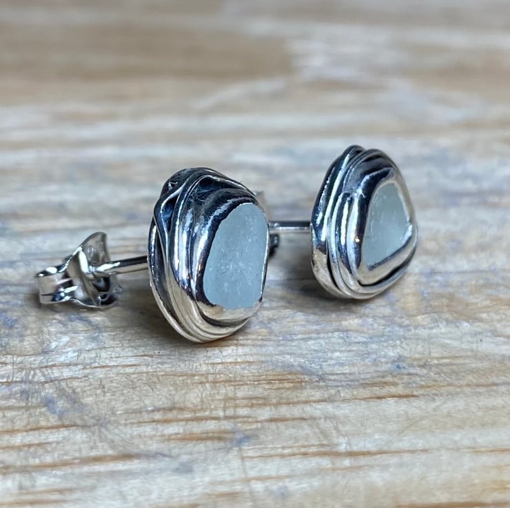 Gorgeous handmade sterling and fine silver stud earrings with beautiful pieces of beige grey coloured welsh sea glass collected from a North Wales beach. The sea glass has been set in the silver then wrapped with silver wire to add texture. These earrings are entirely unique and are sisters not twins! The glass shines different shades in different lights, they are simply stunning.