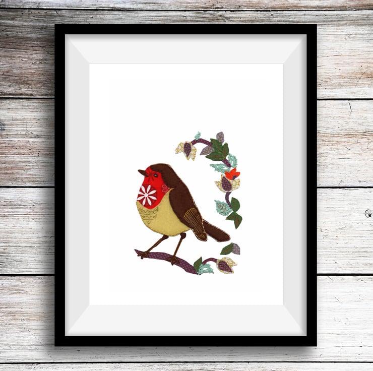 I added shiny embellishment with metallic gold thread, by creating intricate detailing on the robin's wing and sparkly accents on the fabric leaves. The thread catches the light and glistens, bringing the whole piece to life. The stitching is visible on the back of the artwork.