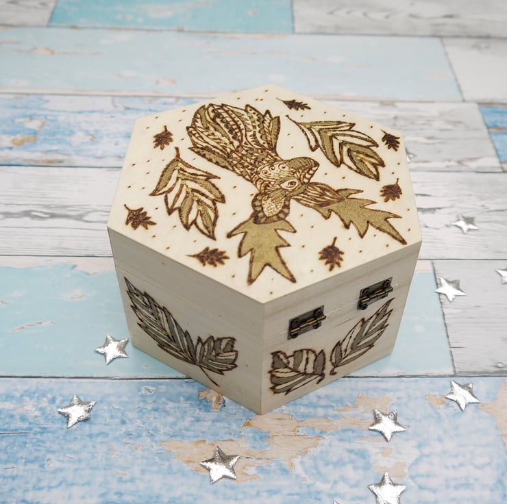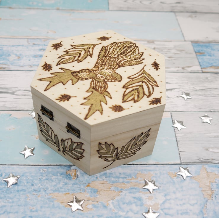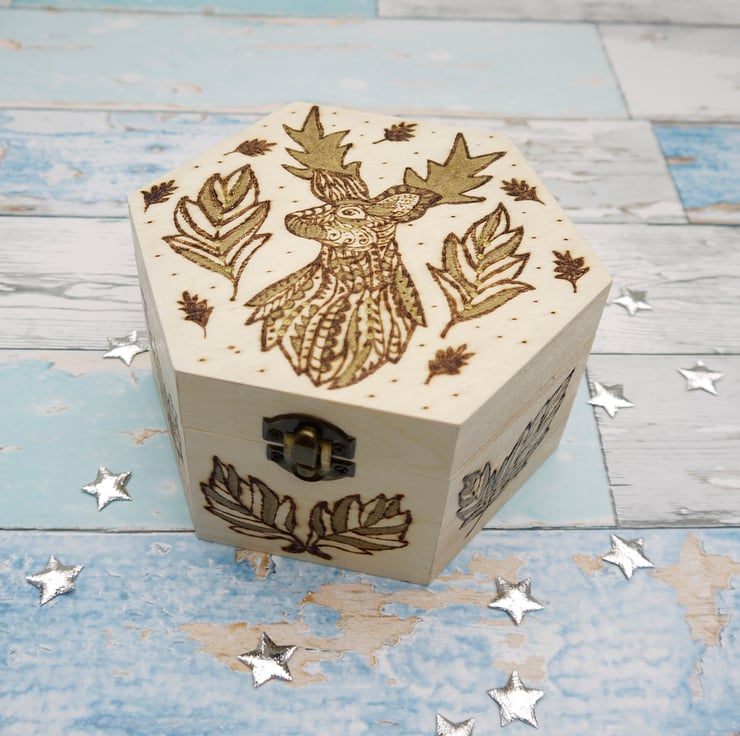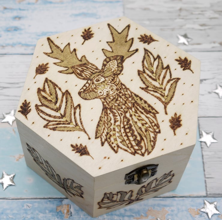 A stags has has be burnt into the wood on the lid of the box using traditional methods of pyrography. The stag is filled with zentangle patterning and pyrograph shading.