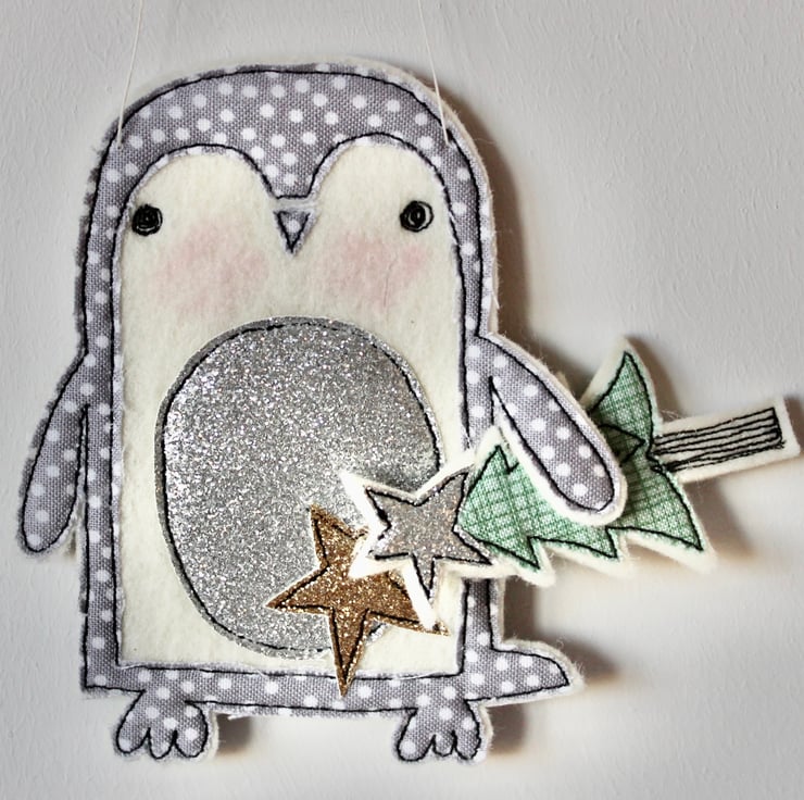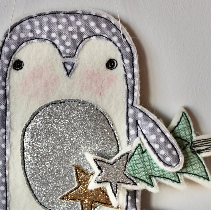 Penguin is created using 100% wool felt, cotton cloth, glitter cloth and free hand machine embroidery; multiple layers of cloth are sewn together and cut out by hand using sharp scissors.
