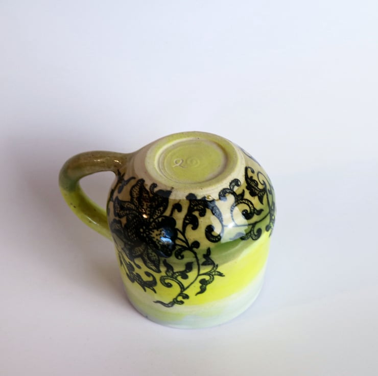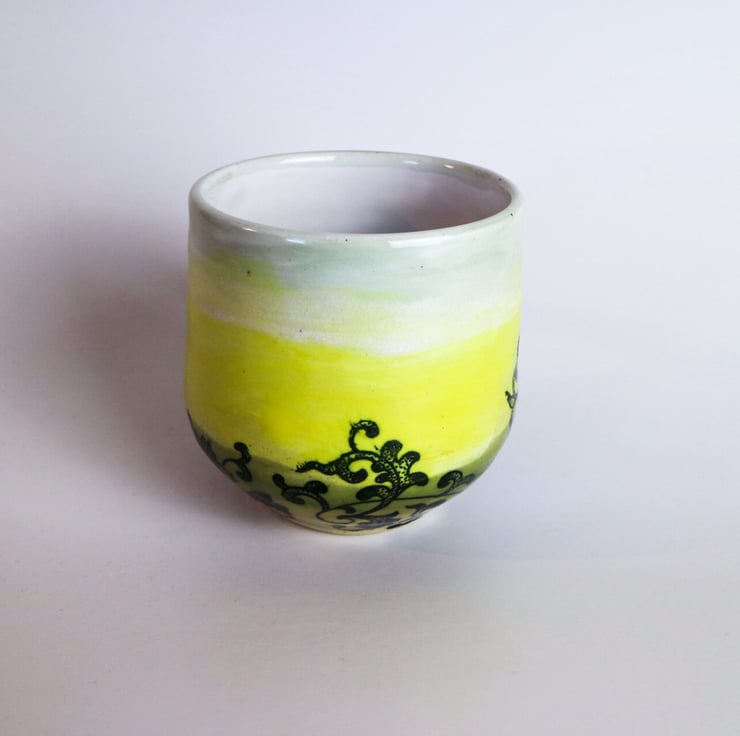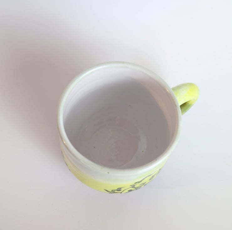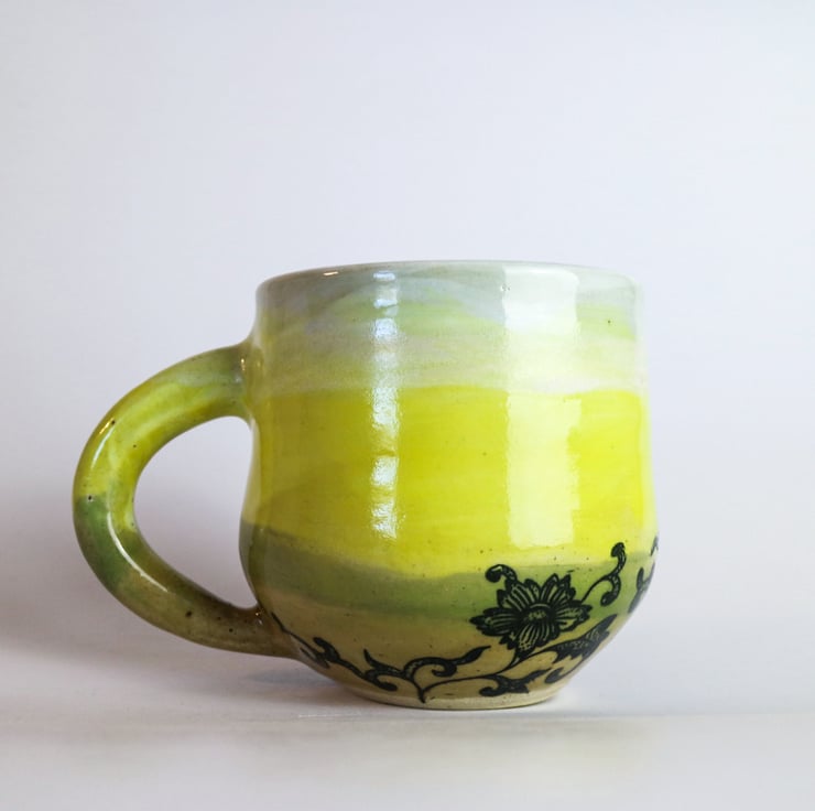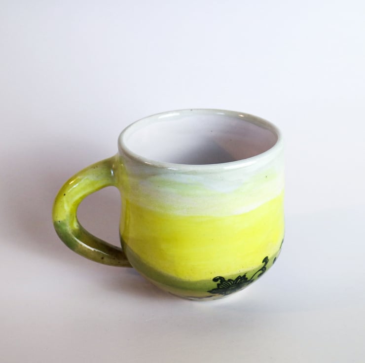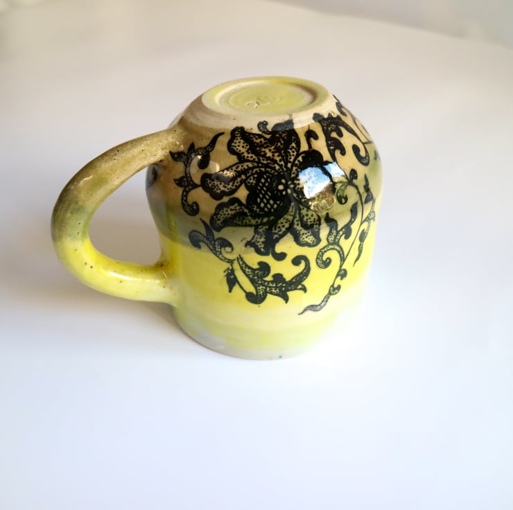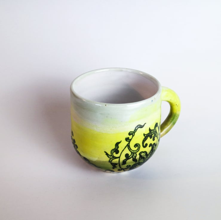 A wheel thrown stoneware mug with energising zesty yellow glaze and trailing design around the base.