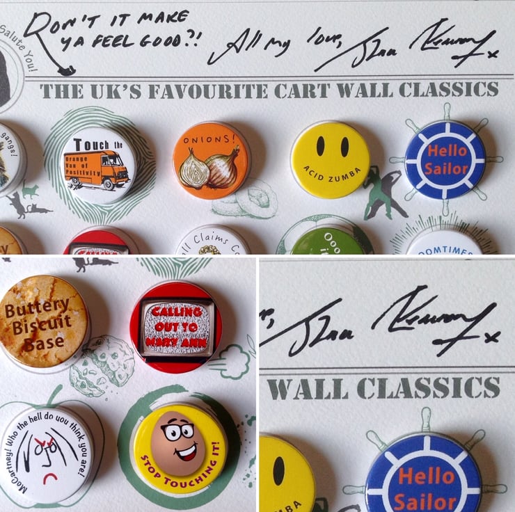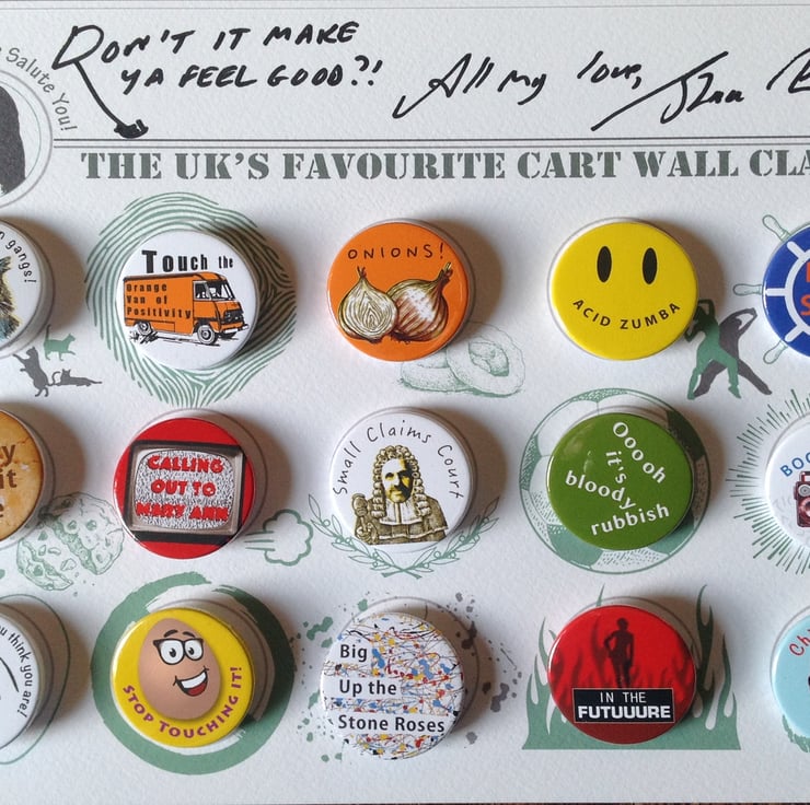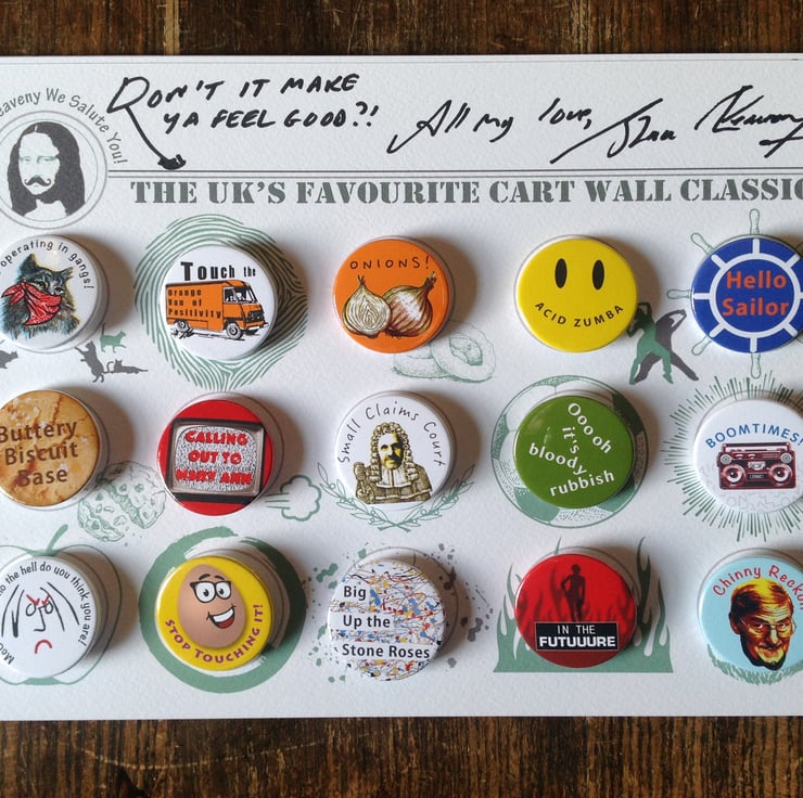 Featuring all 15 of our x38mm button pin badges inspired by the Cart Wall on a specially designed A4 card backing each piece has been hand inscribed with a unique message from Shaun himself, no two are the same, so choose carefully as when they're gone, they're GONE!