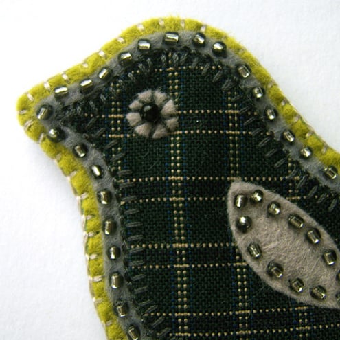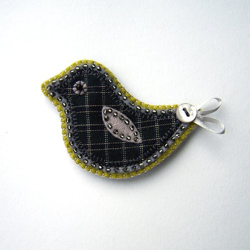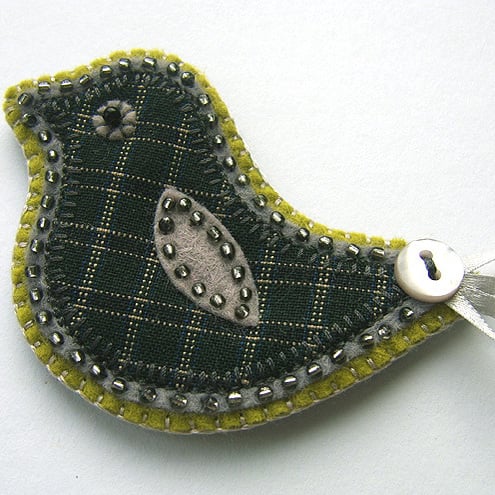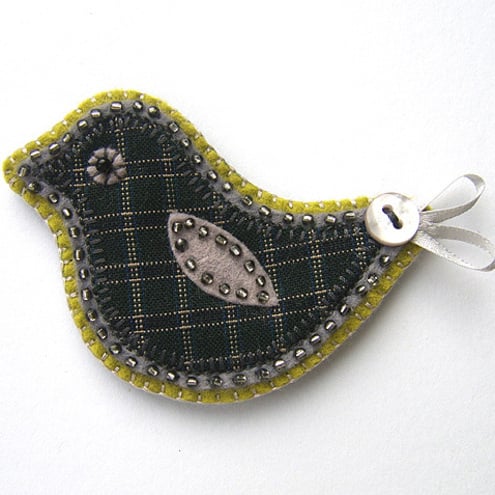 It features a little bird in a wool check fabric with beaded eye and pretty ribbon and button tail. It has been appliqued onto grey felt and edged with coordinating seed beads. It is mounted onto a lime green felt base and has a brooch backing for easy attachment.